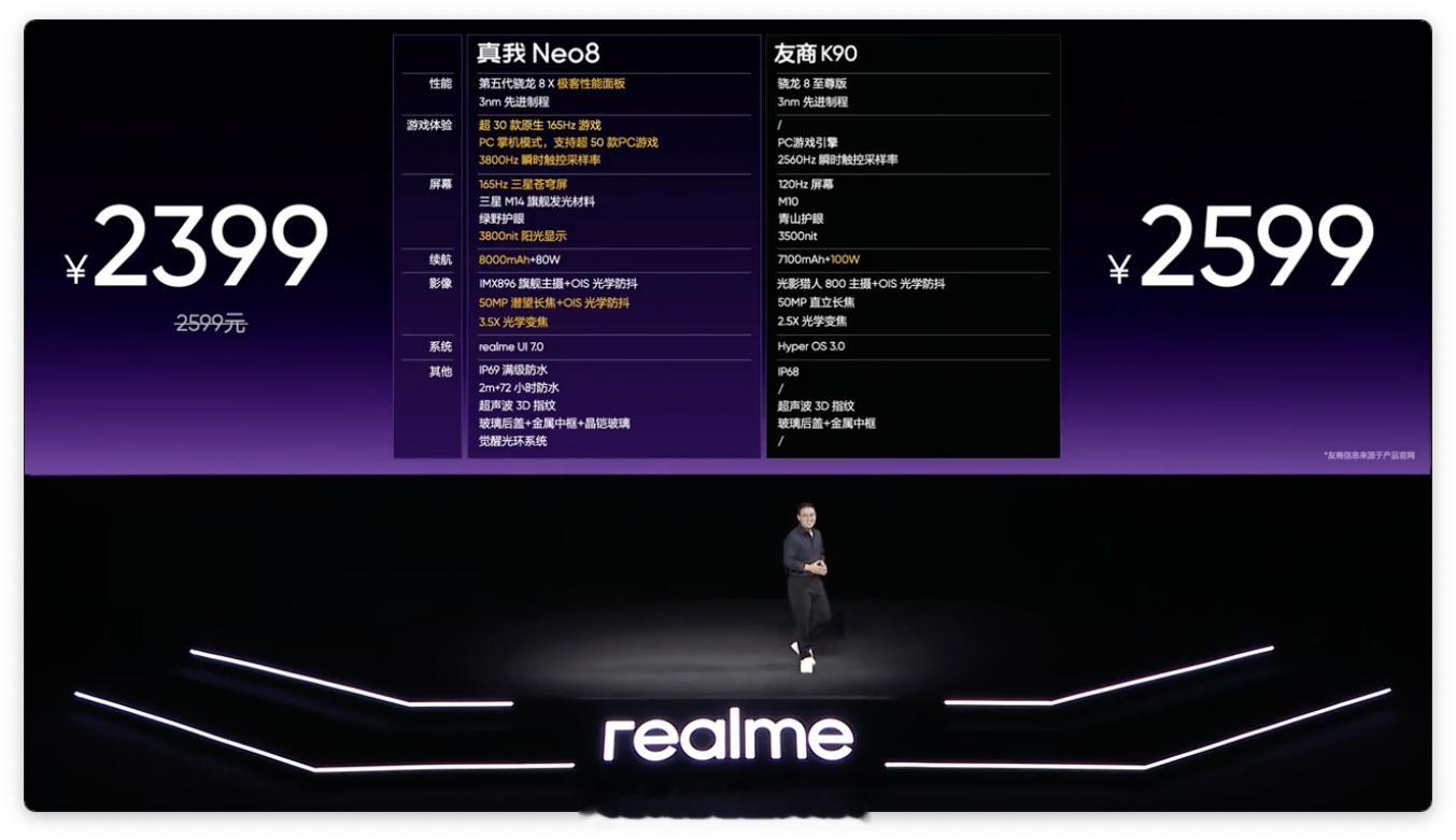 好家伙,真我 Neo8 定价 2399 元起,首发就支持国补。12GB+256GB:首销价 2399 元,国补到手价 2039.15 元16GB+256GB:首销价 2699 元,国补到手价 2294.15 元12GB+512GB:首销价 2899 元,国补到手价 2464.15 元16GB+512GB:首销价 3199 元,国补到手价 2719.15 元16GB+1TB:首销价 3699 元,国补到手价 3199 元非常推荐直接上大内存大存储的版本。今年 4 月,真我手机全面接入 OPPO 售后服务。