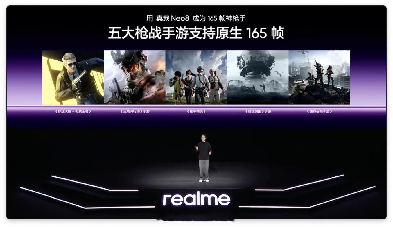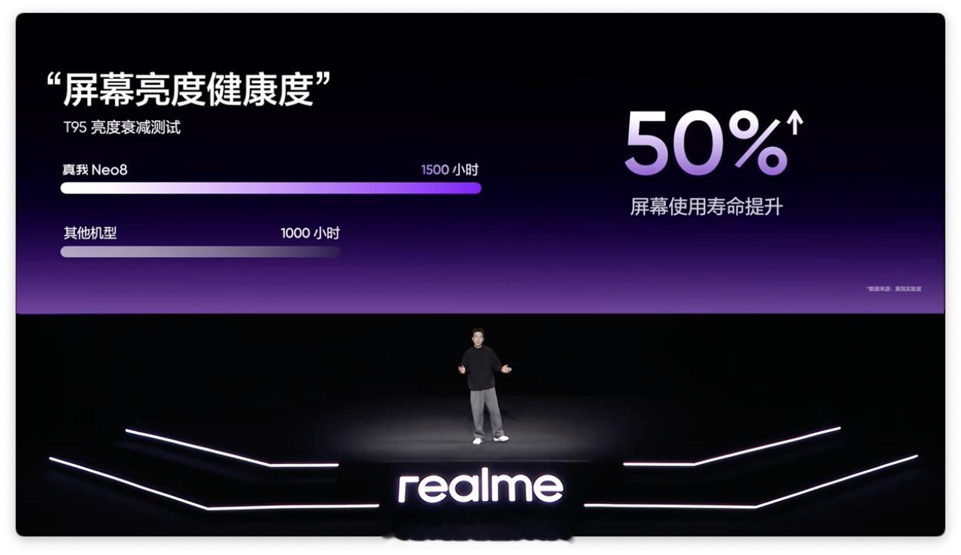 果然,realme Neo 8 也搭载了 165Hz 的三星苍穹屏。采用三星最新的旗舰发光材料 M14,也加入到普及 165Hz 超高刷新率的行列里来。真我:「这是真我的第一个 165Hz,挑战行业最强 165Hz。」除此之外,为了跟上 165Hz 的屏幕刷新率,Neo8 还有一颗「妙感触控芯」,支持 3800Hz 瞬时触控采样率。而且还有旗舰级全亮度 DC 调光,护眼这一块,也是拉满了。