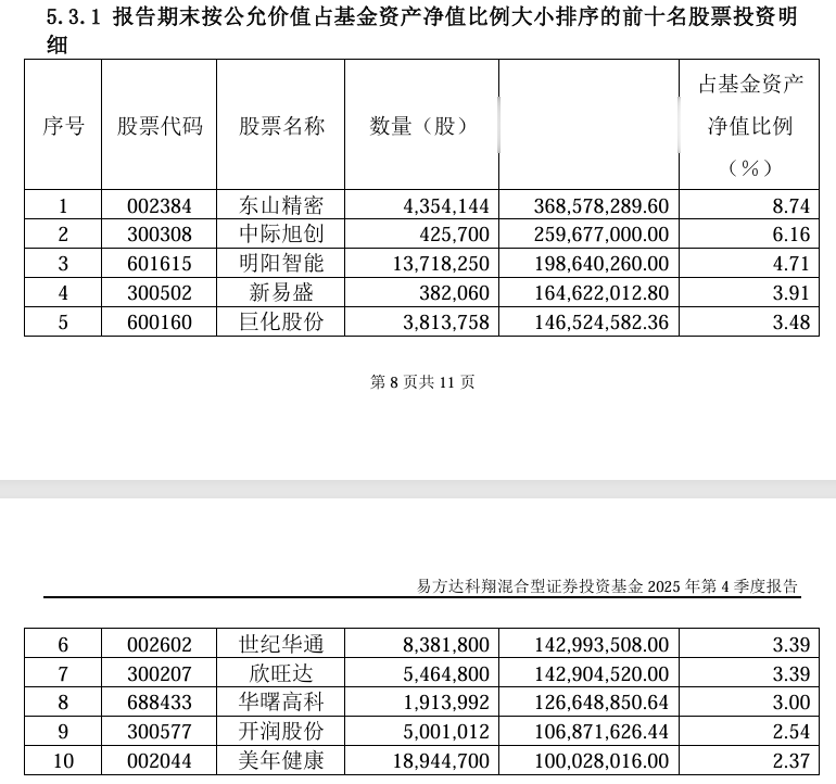 以易方达基金知名基金经理陈皓管理的易方达科翔为例,该基金2025年四季度重仓的AI相关板块贡献显著,截至2025年四季度末,该基金前十大重仓股包括中际旭创、新易盛等多只AI概念股。