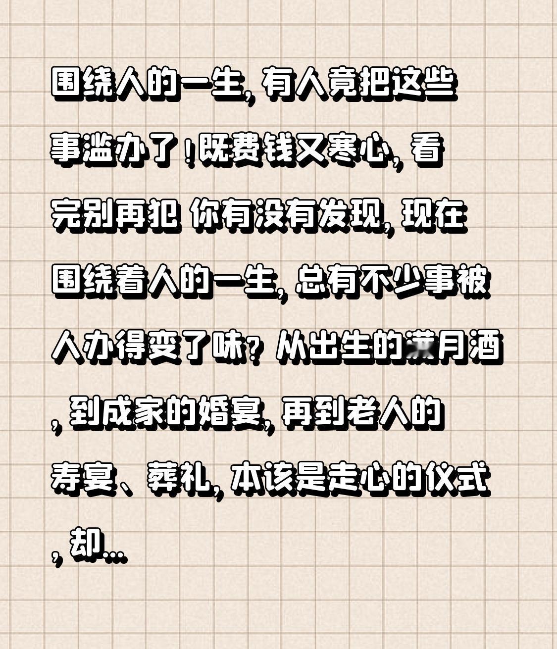 围绕人的一生,有人竟把这些事滥办了!既费钱又寒心,看完别再犯 你有没有发现,现在围绕着人的一生,总有不少事被人办得变了味?从出生的满月酒,到成家的婚宴,再到老人的寿宴、葬礼,本该是走心的仪式,却被一些人办成了讲排场、收份子的攀比局,滥办的背后,藏着太多费钱又寒心的现实! 生娃办满月酒,本是分享新生命到来的喜悦,可有人孩子刚落地,就忙着定高端酒店、摆几十桌,挨个通知亲戚朋友,哪怕八竿子打不着的远房亲戚,也得凑份子;结婚办婚宴,原本是见证爱情的美好,却成了拼场地、拼彩礼、拼车队的赛场,为了撑场面,不惜借钱办酒席,婚后一屁股债,把好好的喜事变成了负担;就连老人过寿、办葬礼,也有人比谁的宴席更豪华,谁的排场更大,完全忘了寿宴是为了尽孝,葬礼是为了缅怀,反倒成了自己炫耀的舞台。 更让人无奈的是,除了这些人生大事,各种无意义的酒局、人情局也在滥办:孩子上幼儿园办酒,考个普通大学办酒,甚至搬个家、开个小店,都要大摆宴席收份子。有人一年到头,光随礼就花掉大半个月工资,不去怕得罪人,去了又心疼钱,原本的人情往来,硬生生变成了“人情债”,越随越累,越处越生分。 这里藏着最关键的转折点:仪式的意义,从来不在排场大小、酒席多少,而在心意真假、情分深浅。办酒本是为了聚人情、暖人心,可滥办的宴席,拼的是面子,耗的是金钱,凉的是人心。那些为了攀比办的几十桌酒席,不如一家人围坐的一顿家常饭;那些收来的厚厚一沓份子钱,不如亲戚朋友一句真心的祝福。真正的人情,从不是靠酒席撑起来的,更不是靠份子钱衡量的,而是藏在日常的互相惦记、遇事的伸手相助里。 人这一辈子,从生到死,真正珍贵的从来不是那些光鲜的排场,而是身边人的真心相待。满月酒的意义,是看着孩子平安降生的欢喜;婚宴的意义,是往后余生彼此相伴的承诺;寿宴的意义,是陪老人安享晚年的孝心;葬礼的意义,是对逝者的缅怀与思念。这些事,贵在心诚,不在席盛,一旦滥办,就丢了原本的初心,成了毫无意义的形式。 别再为了面子滥办宴席,别再让人情往来变成金钱交易,别再把走心的仪式,办成寒心的攀比。真正的体面,从不是摆出来的,而是活出来的;真正的人情,从来不是随出来的,而是处出来的。 你身边有没有遇到过滥办酒席的情况?评论区说说你的经历,点赞转发,让更多人明白,仪式的初心是心意,不是排场,别让人情被功利裹挟!
