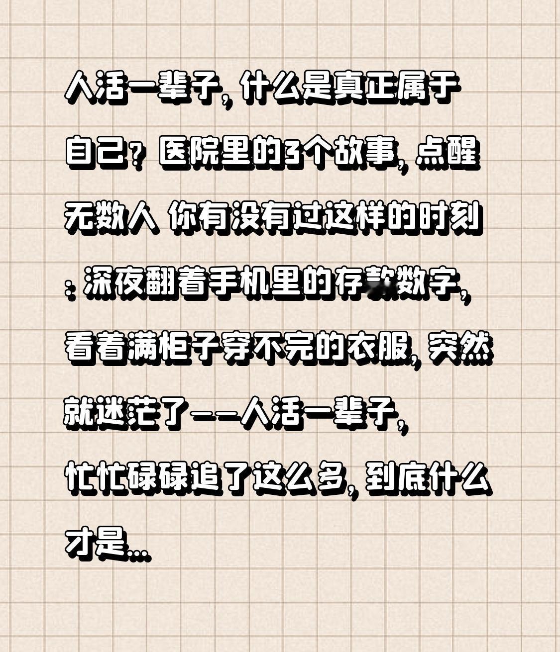 人活一辈子,什么是真正属于自己?医院里的3个故事,点醒无数人 你有没有过这样的时刻:深夜翻着手机里的存款数字,看着满柜子穿不完的衣服,突然就迷茫了——人活一辈子,忙忙碌碌追了这么多,到底什么才是真正属于自己的? 前几天陪亲戚去医院体检,走廊里的3个场景,彻底给我整明白了。 排队挂号时,旁边坐着个打扮光鲜的大姐,手里攥着厚厚一沓化验单,对着电话那头哭:“我赚了一辈子钱,买了3套房,现在住院了,房产证再多,能替我遭罪吗?”挂了电话,她从包里掏出速效救心丸,独自坐在角落抹眼泪。那一刻我突然发现,我们拼命追求的财富、房产,原来都是身外之物,生不带来死不带去。 抽血窗口前,一对老夫妻让我看湿了眼眶。大爷推着轮椅上的大妈,手里拎着保温桶,一边给大妈擦手一边说:“别担心,医生说了问题不大,等你好了,咱们还去公园遛弯,我还给你唱你最爱的京剧。”大妈笑着点头,伸手拂去大爷头上的白发。他们身上没穿名牌,手里也没有贵重物品,但彼此眼里的牵挂,是多少钱都买不来的。 最让我触动的是病房里的一位大叔。他刚做完手术,身体还很虚弱,却每天坚持看书、听评书。我问他不难受吗?他说:“难受啊,但这辈子忙工作、忙家庭,没好好为自己活过。现在躺在这里才明白,健康的身体、脑子里的知识、心里的快乐,才是别人拿不走的东西。” 年轻时我们总以为,赚更多钱、住更大的房子、拥有更高的地位,人生就圆满了。可走着走着才发现,财富会贬值,地位会变迁,就连身边的人也可能离开。 真正属于你的,是清晨醒来能自由呼吸的健康,是历经风雨依然乐观的心态,是家人朋友毫无保留的关爱,是无论顺境逆境都不放弃的自己。 房子是租来的还是买来的,不重要;存款是多是少,也没关系。重要的是,你是否拥有健康的身体去感受生活,是否有温暖的情感去滋养心灵,是否有足够的底气去面对人生的起起落落。 人活一辈子,赤条条来,赤条条去。别把太多精力浪费在虚无的身外之物上,好好爱自己,珍惜身边人,用心感受每一天的阳光和温暖。这,才是真正属于你的财富。 看完今天的视频,你觉得什么才是真正属于自己的?欢迎在评论区留下你的答案,也别忘了点赞转发,让更多人明白生活的真谛。