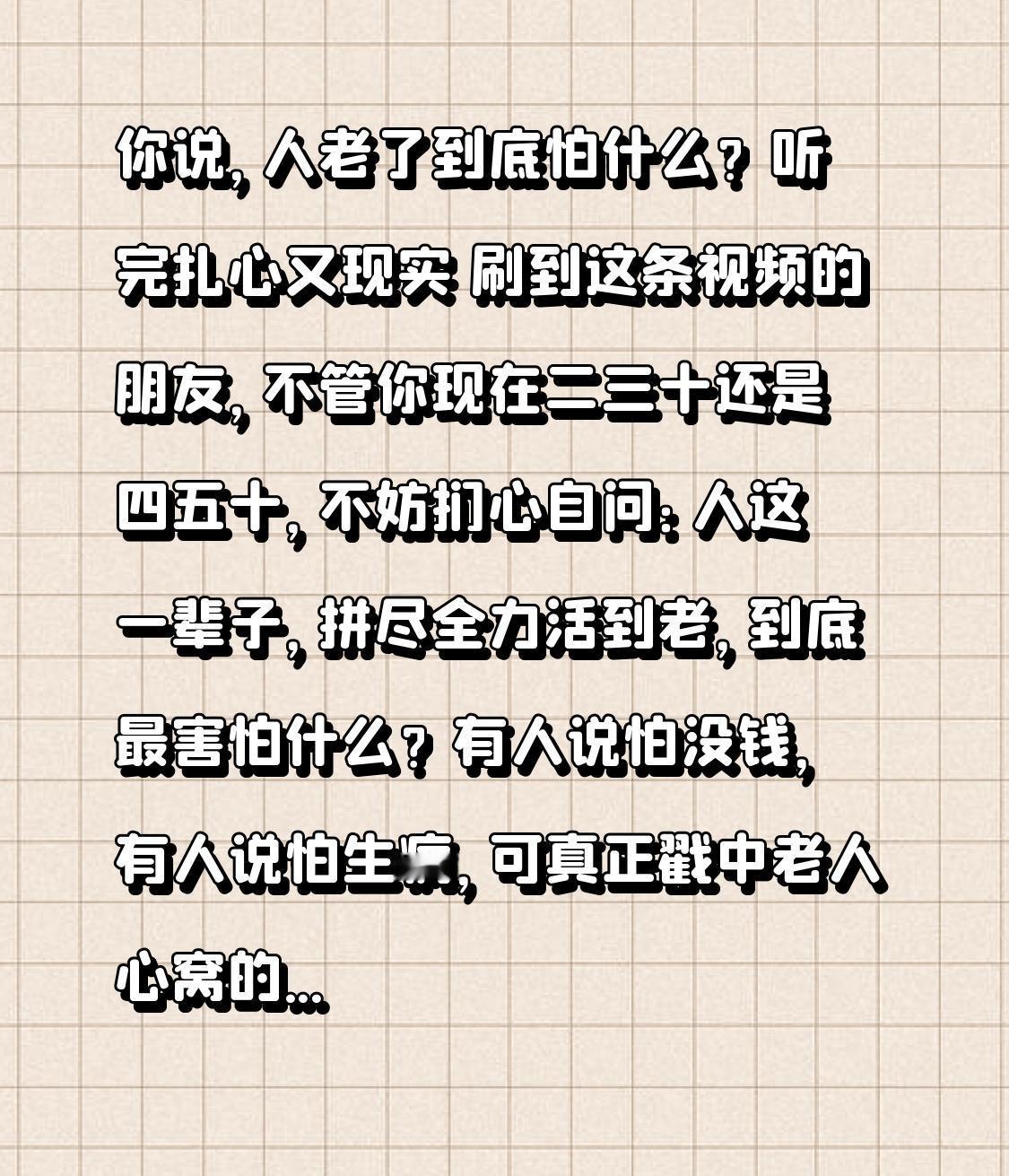 你说,人老了到底怕什么?听完扎心又现实 刷到这条视频的朋友,不管你现在二三十还是四五十,不妨扪心自问:人这一辈子,拼尽全力活到老,到底最害怕什么?有人说怕没钱,有人说怕生病,可真正戳中老人心窝的,从来都不是这些表面的东西,听完你一定会感同身受! 我们总以为,人老了有养老金、有存款,衣食无忧就够了。可身边的老人却用实际生活告诉我们,比起没钱,他们更怕的是身体垮了拖累子女,怕身边没人说话孤零零,怕自己变成家里的“累赘”。 小区里的张大爷,退休金不少,儿女也孝顺,可自从老伴走后,就总一个人坐在楼下石凳上发呆。儿女忙工作,一周来一次,每次来都塞钱买东西,可大爷总说“钱我有,你们坐会儿说说话就行”。有次大爷摔了一跤,怕儿女担心,硬是自己撑着爬起来,直到邻居发现才通知孩子;隔壁的李奶奶,身体还算硬朗,却总把“我老了,啥也干不了,净给你们添麻烦”挂在嘴边,就连让儿女帮忙洗个衣服,都觉得不好意思。 很多人都搞错了,这就是最关键的转折点:人老了,最怕的从来不是贫穷和病痛,而是被忽视、被冷落,是那份深入骨髓的孤独,是觉得自己“没用了”的失落。有钱能治身体的病,却填不了心里的空;有儿女的照顾,却未必能懂老人心里的盼。他们怕的不是老去,而是老去后,在家人的生活里没了位置;怕的不是身体不便,而是连开口求帮忙,都觉得是打扰。 其实老人要的真的不多,不是多贵的礼物,不是多厚的钞票,只是儿女的一句贴心话,一次耐心的陪伴,只是吃饭时有人搭句话,出门时有人扶一把,只是让他们知道,自己永远是家里的一份子,从来都不是累赘。 我们都会老,今天父母经历的,就是明天我们要面对的。别总说“等我有空了再陪爸妈”,别总把“给钱就是孝顺”挂在嘴边,父母的时光经不起等待,他们的孤独,也熬不起漫长的期盼。 趁父母还在,趁时光未老,多回家看看,多打个电话,多一点耐心,少一点敷衍。别让孝顺只停在朋友圈,别让陪伴成为一辈子的遗憾。 你觉得人老了还怕什么?评论区说说你的心里话,点赞转发,让更多人看到老人的心声,别让深爱我们的父母,在晚年活成了孤独的模样!