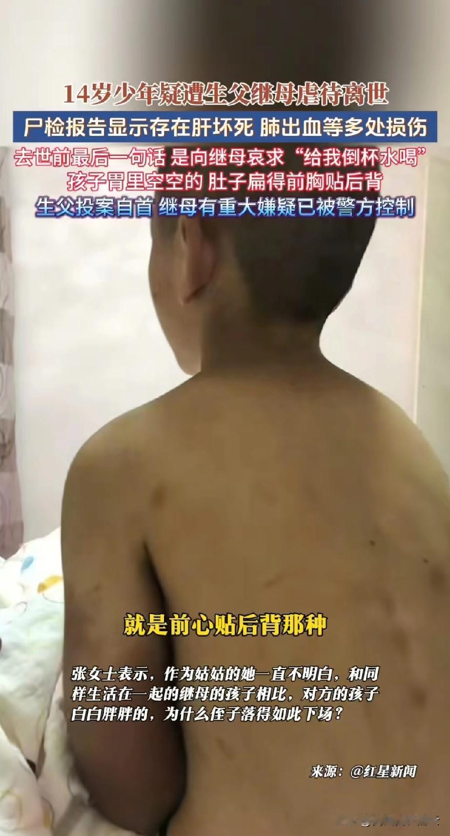 河南被虐待的14岁男孩,亲爸和后妈罪不可赦。但是亲妈也太不称职了。如果她能多去看看孩子,可能就不会有这样的悲剧了。 可怜这个孩子遇到了一对不负责的父母,他才6个月大时亲生父母离婚。亲妈嫌孩子是累赘,一走了之,多年来不管不问。 孩子爸爸开大货车,也不管孩子,把孩子扔给自己的妹妹和母亲照顾。 直到孩子9岁时,他非要抚养儿子。姑姑虽然觉得这个弟弟不靠谱,但是人家才是孩子的生父,第一监护人,她不得不放手。 亲爸和后妈照顾以来,不让姑姑和奶奶见孩子,却一直让奶奶出抚养费。我看孩子亲爸和孩子根本没有感情,就是为了钱照顾孩子的吧。 姑姑说孩子被虐待S了,她弟弟都没有悔意,这样的人配当父亲吗?如果亲妈能回来看看孩子的话,她把抚养费争过来让姑姑奶奶养也行啊! 亲妈呢,又在哪里呢? 还有孩子后妈,你也是母亲,你自己的孩子养的白白胖胖的,为什么你继子瘦的皮包骨头? 这三个人没有一个是无辜的。