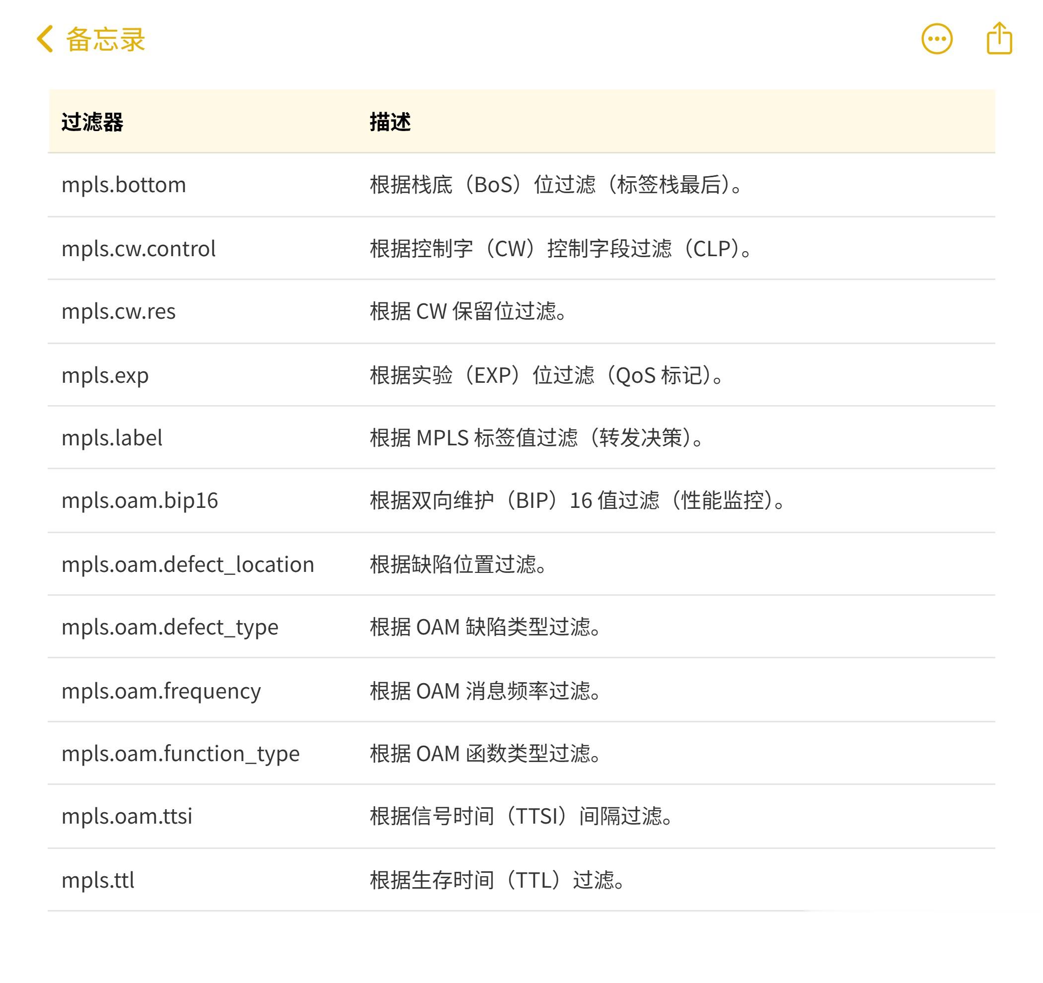 实用技巧:mpls.label == 100 – 特定标签流量。示例:mpls.exp == 5 – 中等 QoS。