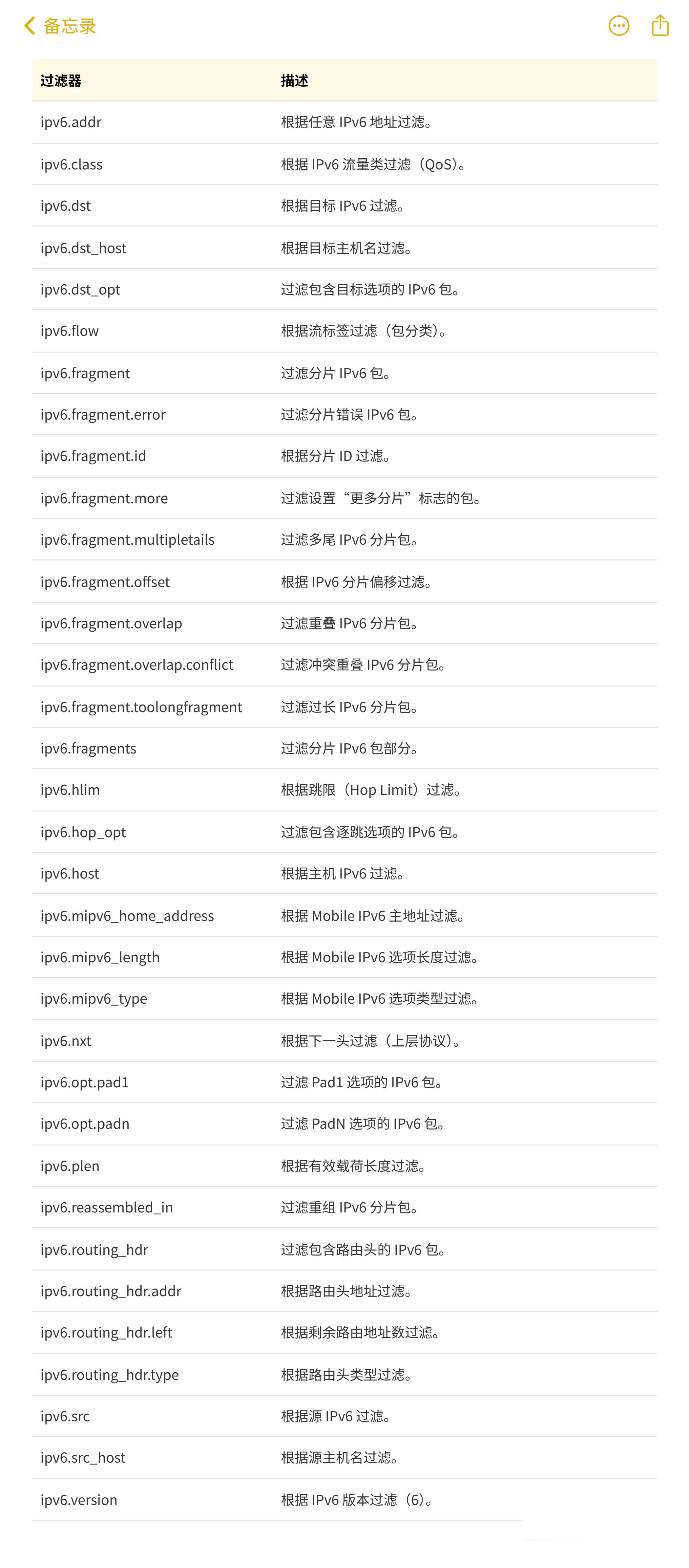 12. IPv6 协议过滤器IPv6 过滤类似 IPv4,但增加流标签、扩展头。ipv6.src/dst 基础。