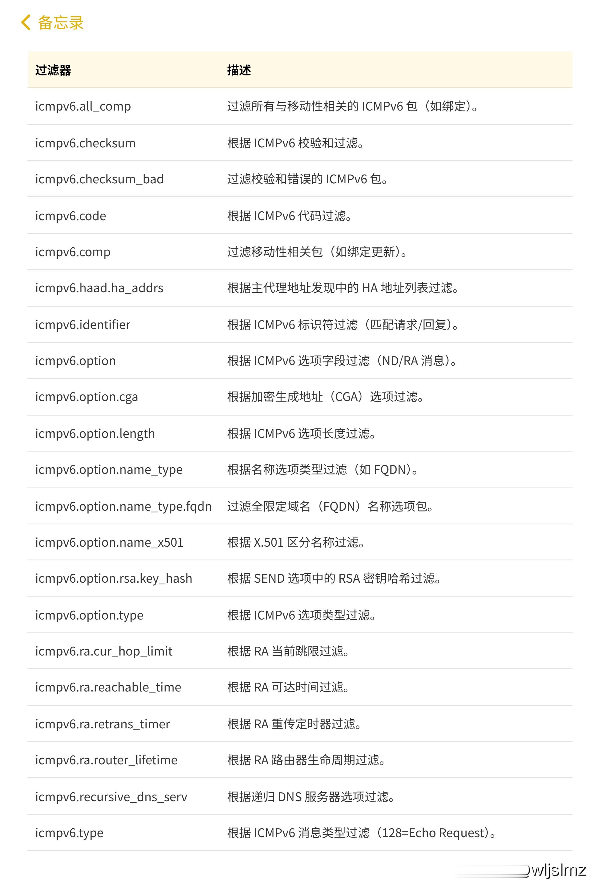 9. ICMPv6 协议过滤器ICMPv6 扩展了 IPv6 的邻居发现、移动性支持。过滤器类似 ICMP,但增加选项和 RA 字段。