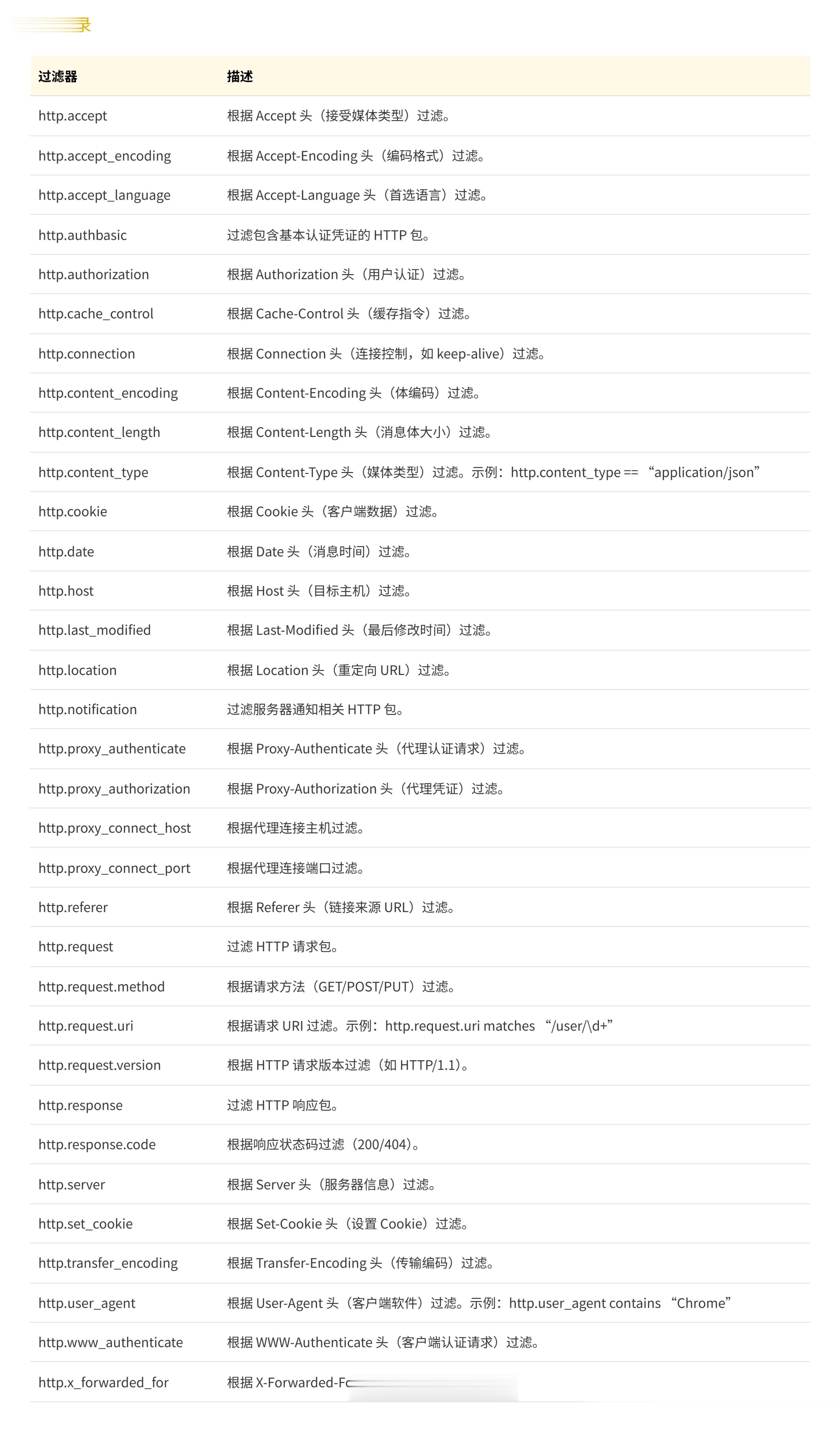 7. HTTP 协议过滤器HTTP 是 Web 流量主力,过滤器覆盖头字段、方法、状态码。适用于应用性能监控和安全扫描。