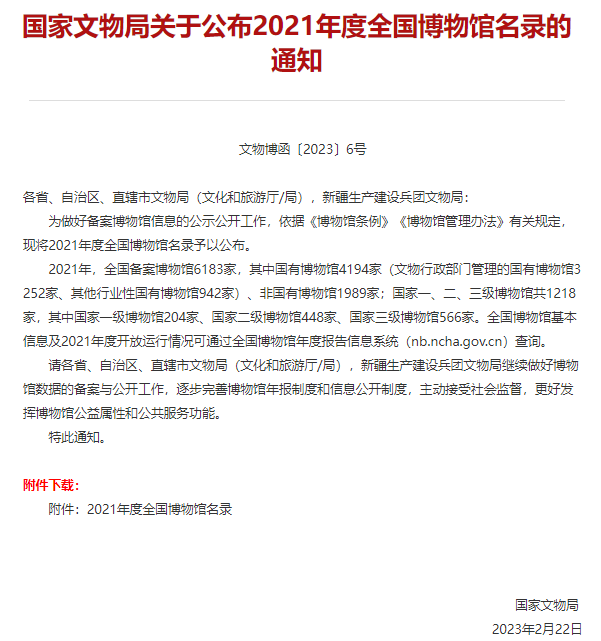 其中国有博物馆4194家(文物行政部门管理的国有博物馆3252家、其他行业性国有博物馆942家)、非国有博物馆1989家;