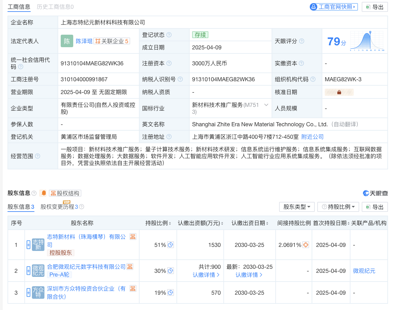 该公司2025年半年报显示,合资公司于2025年4月9日完成工商登记手续并取得营业执照,合资公司名称为上海志特纪元新材料科技有限公司,注册资本为3000万元,其中横琴志特认缴出资1530万元,出资比例为51%。