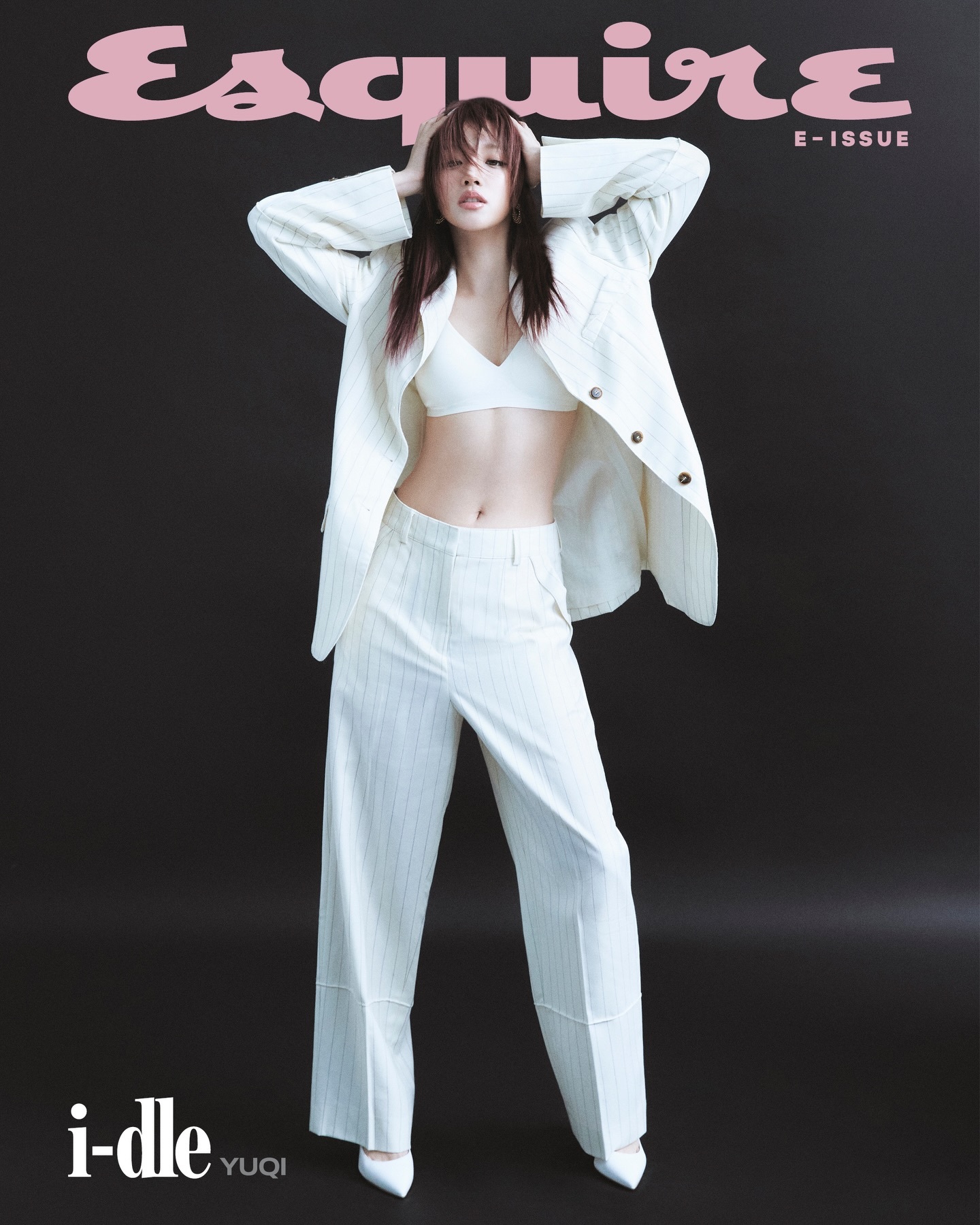 宋雨琦亮相韩版《Esquire》新期数字封面,一身白色条纹西装内搭胸衣造型,雨琦