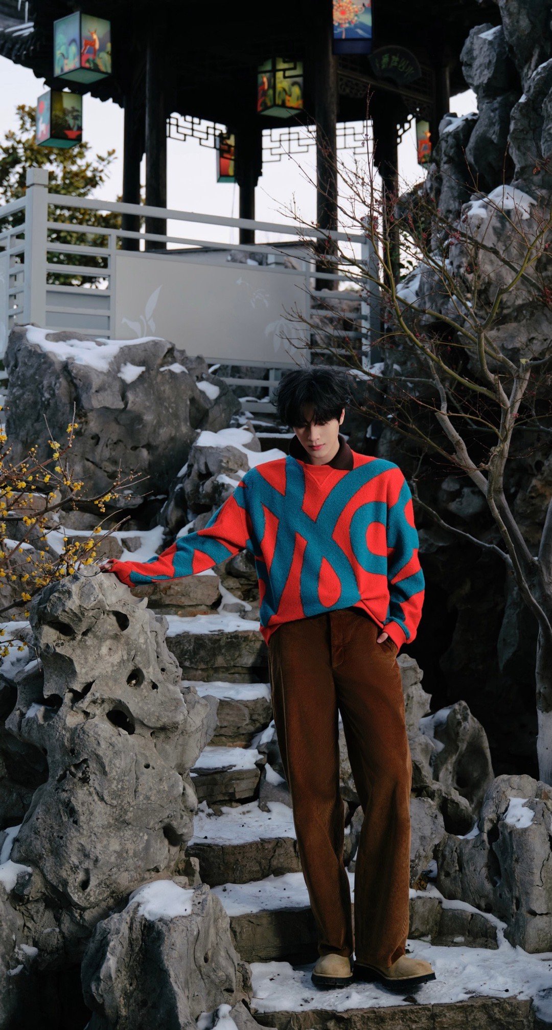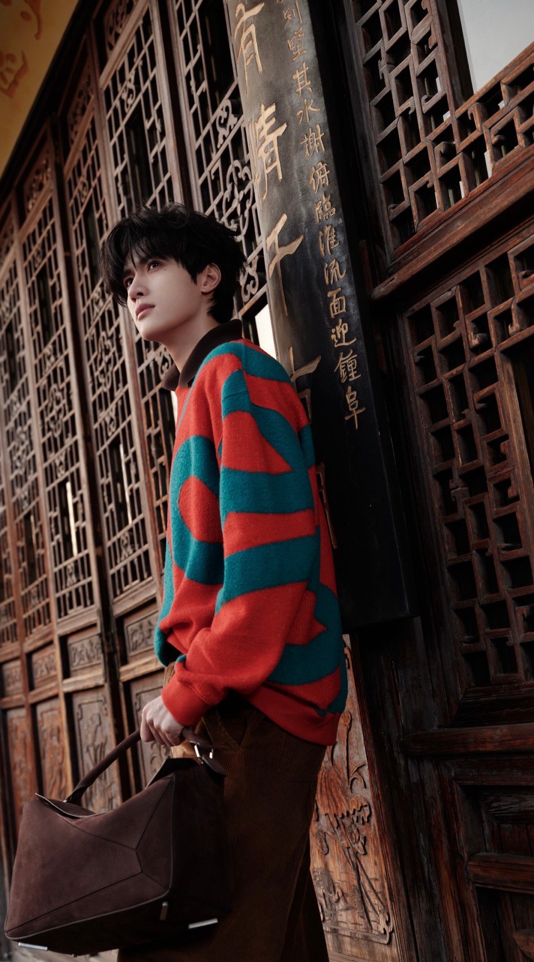 展轩出席LOEWE盏盏新年灯会活动图集,身着线条涂鸦针织衫搭配灯芯绒长裤,手提品