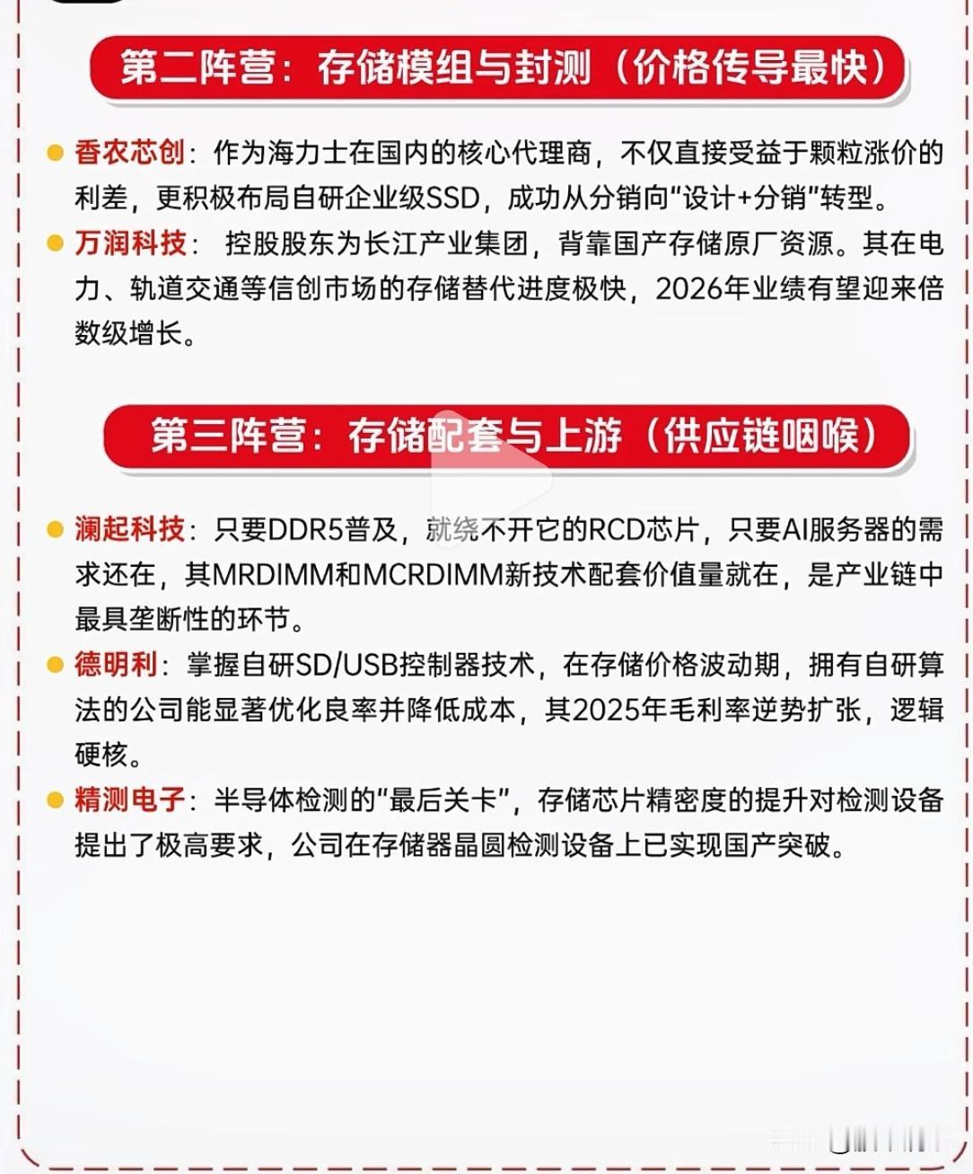 存储产业迎来新机遇:全链条受益于市场新周期 随着市场供需关系改善与技术进步驱动,存储行业正步入新一轮上升周期。产业链各个环节均展现出不同程度的成长潜力与市场弹性,相关领域的热度与关注度持续提升。 核心设计与研发领域。这一环节处于产业链上游,技术壁垒高,利润空间相对集中。具备自主设计与研发能力的企业,不仅在行业标准升级中扮演关键角色,也最能从产品结构优化中直接获益。随着高端应用需求增长,该环节的长期发展潜力受到市场广泛认可。 模组与封测环节。该环节紧贴市场终端,对产品价格变动的反应最为迅速。拥有品牌、渠道或关键技术能力的企业,能在市场景气度提升初期,更快地将上游变化转化为自身业绩。其业务模式也使得经营弹性较大,是观察行业景气度的重要窗口。 上游配套与设备领域。作为产业链的“基石”与“咽喉”,这一环节涵盖了核心配套芯片、关键部件及精密检测设备。其增长与特定技术路线的普及深度绑定,具有较高的确定性和一定的技术垄断属性。产业链的整体升级与国产化趋势,为其带来了长期的结构性机遇。 总体而言,当前市场对存储产业的关注情绪偏向积极。行业在经历了周期性调整后,正受益于技术迭代、需求复苏与供应链重塑等多重动力。未来走势上,具备核心技术、深度绑定高增长赛道(如汽车电子、人工智能服务器)以及受益于国产化替代逻辑的环节,有望展现出更强的持续发展能力。然而,产业发展仍需关注全球经济环境与终端需求的实际变化。 存储芯片 存储芯片概念股 存储半导体行业 存储产业链 算力存储板块 存储芯片技术 存储芯片板块 存储芯片行情 股市分析 黔椒苑正宗贵州水城羊肉粉贵州特产六盘水牛肉米粉米线方便速食