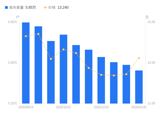 日期A股户数(户)流通A股户均持股数(股)户均持股市值(万元)2026-01-20585047731.7610.242025-12-31596077588.699.442025-12-19601367521.939.312025-12-10611427398.179.182025-11-28625837227.829.222025-11-20635037123.119.602025-10-31655426901.519.432025-10-20642987035.049.282025-09-30671806733.249.712025-09-19679376658.219.53