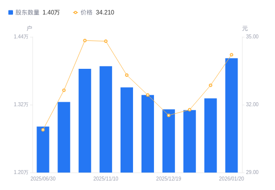 日期A股户数(户)流通A股户均持股数(股)户均持股市值(万元)2026-01-201402222571.1777.222026-01-101331323773.2278.122025-12-311310524261.9277.102025-12-191311824237.8876.422025-11-301337323775.7177.102025-11-201350623541.5778.422025-11-101388122905.5979.732025-10-311383622980.0980.062025-09-301324824000.0478.342025-06-301281424812.9076.65