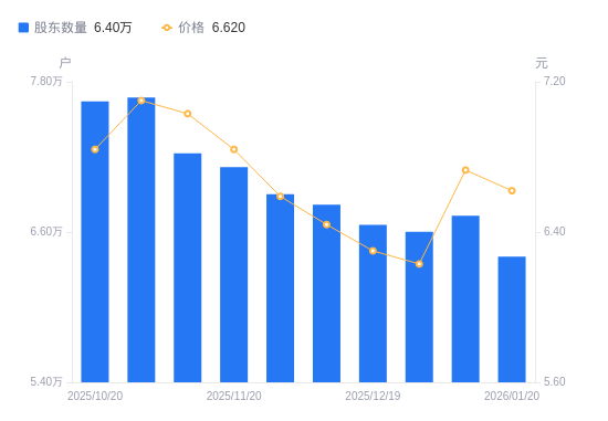 日期A股户数(户)流通A股户均持股数(股)户均持股市值(万元)2026-01-206403015709.9910.402026-01-096729114948.6610.062025-12-316602215235.999.492025-12-196656715111.259.522025-12-106818414752.889.502025-11-286903014572.089.602025-11-207118514130.939.672025-11-107228113916.669.782025-10-317675313105.819.312025-10-207643813159.829.00