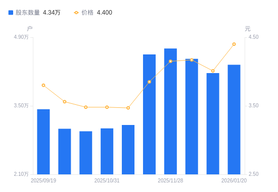 日期A股户数(户)流通A股户均持股数(股)户均持股市值(万元)2026-01-204340030213.0613.292025-12-194170031444.7712.612025-12-104460029400.1612.262025-11-284670028078.0911.652025-11-204550028818.6211.102025-11-103110042162.2814.632025-10-313040043133.1315.012025-10-202980044001.5815.312025-09-303030743265.4815.402025-09-193430038228.7814.53
