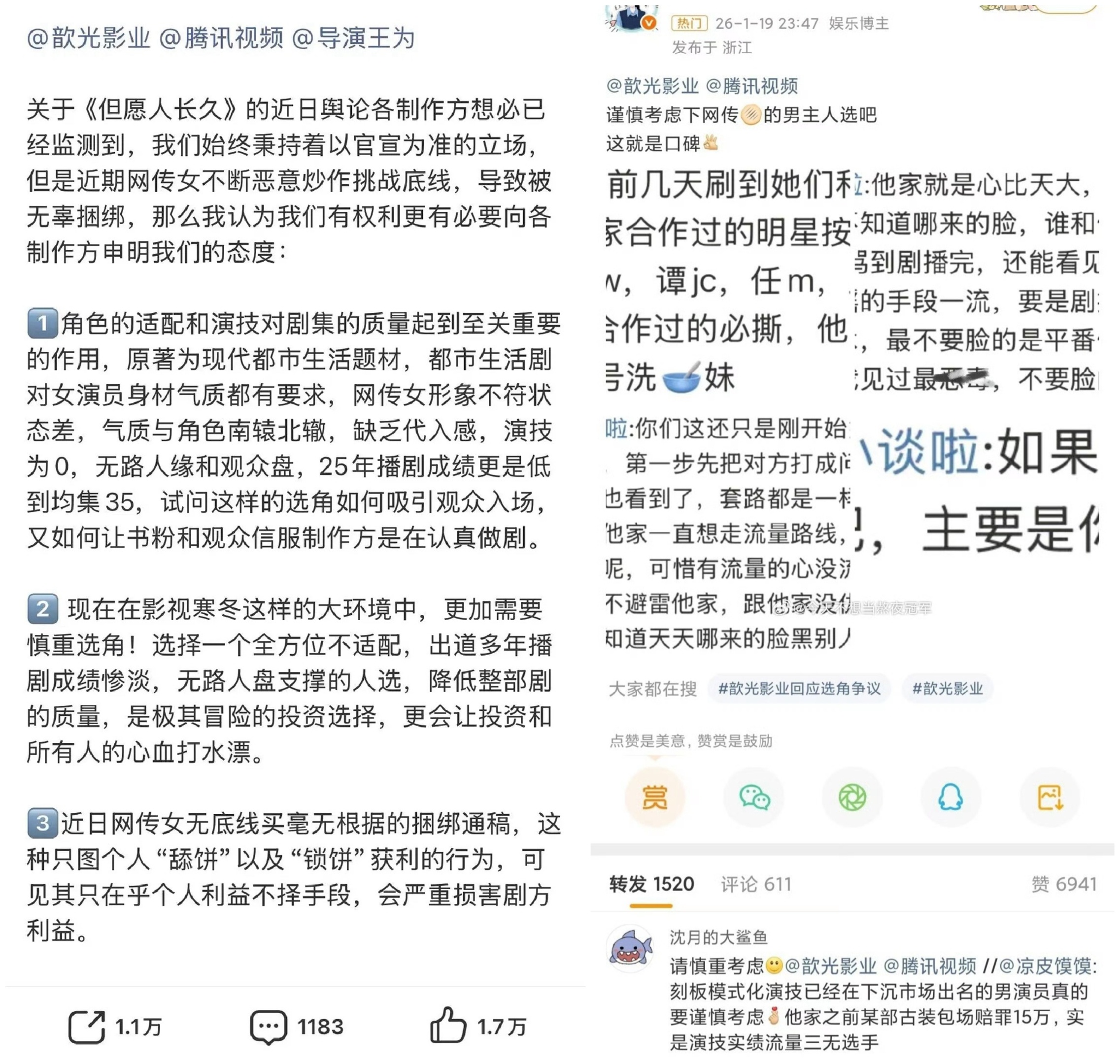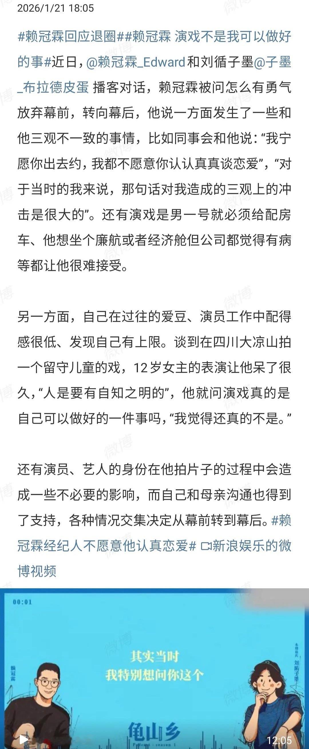 2026-01-22总结①贝克汉姆长子布鲁克林公开发布六千字长文控诉父母长期操控家庭、破坏婚姻且拒绝和解 图1②红舞鞋剧组晒捐款凭证 图2③高晓松打假AI高仿视频带货 图3④赖冠霖在播客中回应退圈原因,谈爱豆规则,演戏就必须是男一号就必须给配房车,想坐个廉航或者经济舱但公司都觉得有病,经纪人说宁可他去约也不想他认真谈恋爱 图4⑤车银优利用妈妈的公司涉嫌逃税200亿韩元 图5⑥王一栩辟谣万花世界短剧制作 图6⑦爱奇艺2026全面进入分账制度 图7⑧优酷,短剧分账 图8撕❶但愿人长久,张晚意粉丝万转永拒,沈月粉丝也要求换男主 图9❷虞书欣丁禹兮cpf禹宙中欣和虞书欣何与随欣所与cpf互指对方虚假 图10❸网传将门毒后开不了机,王鹤棣公司签的意向约马上被拖到期了,接下来将进入电影宣传期。 图11❹许荔莎再跟许凯粉硬刚,否认自己被告,道歉过 图12❺追觅,品牌方约定的陈飞宇官宣时间数次延迟且不通知,粉丝维权,追觅CEO跟粉丝互怼 图13❻ELLE网站编辑部声明,网站遭外部账号以非授权技术手段入侵后台,违规发布点评演员肖战跟藏海传,目前已紧急撤稿并启动自查。粉丝发现该文章最早是点评成毅的,后换名到elle,阅读量跟评论都很少时成毅粉最早发现该文章 图14❼金枝,何不同舟渡等剧组。李一桐,卢昱晓,侯明昊等粉丝公开反对众星时代传媒强推鹤秋,批评其演技不足却频繁"塞人进组",甚至被指"让利同公司演员铺路"图15❽施洛华眼镜因代言人梓渝宣传视频中出现争议镜头(特写一位手持组合手幅的CP粉及竞品标识),引发粉丝之间的争议,道歉,下架争议视频 图16❾何聪睿在宣传新剧《四姊妹的八零年代》时回应剧集凌晨上线争议,被指剧扑甩锅女主 图17❿惊蛰无声,预告,刘诗诗眼神戏被指盲人,刘诗诗粉丝后援会发布电影倡议书,直指杨幂粉恶意中伤 图1820号网页链接