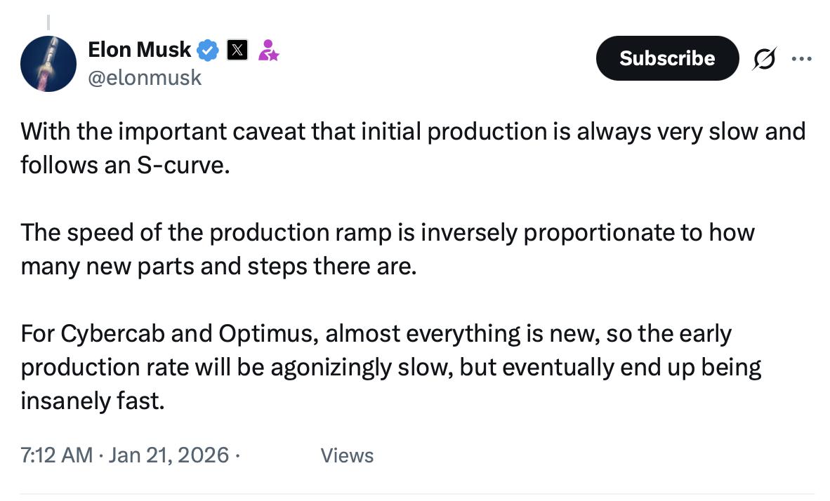 马斯克:无人车和机器人初期生产会很慢 马斯克在推特上回复一则帖子时提到,Cybe