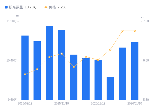 日期A股户数(户)流通A股户均持股数(股)户均持股市值(万元)2026-01-1010778943403.4731.512026-01-0910666443861.2631.842025-12-3110063446489.4331.522025-12-1910412644930.1829.292025-12-1010447044782.2429.562025-11-2810520644468.9528.192025-11-1011025642432.1628.342025-10-3111110042109.8127.752025-09-3010797343329.3527.212025-09-1910910842878.6026.37