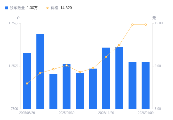 日期A股户数(户)流通A股户均持股数(股)户均持股市值(万元)2026-01-091301817323.2525.672025-12-311301817323.2525.672025-11-281473115308.8118.322025-11-201465715386.1015.862025-10-311221818457.5216.062025-10-201169119289.5415.742025-09-301273617706.8216.112025-09-191154019541.9416.752025-09-101623213893.1711.162025-08-291401816087.4610.57