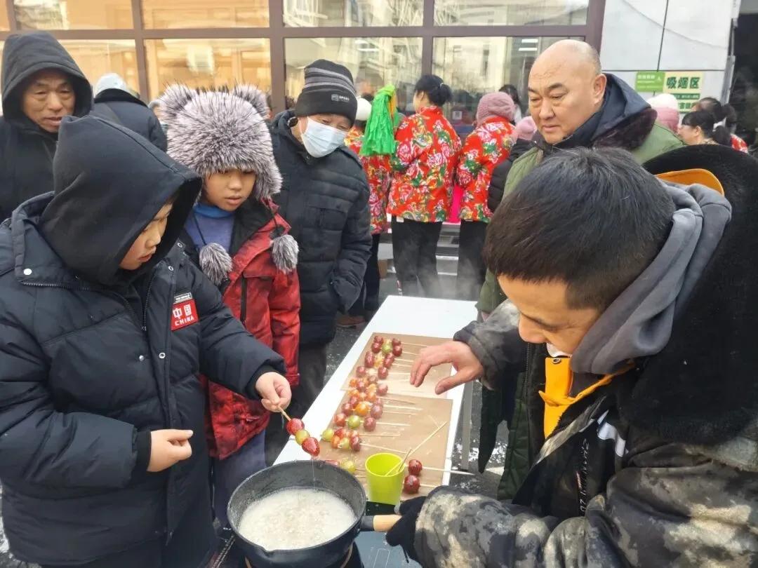 大家一边品尝热气腾腾的杀猪菜、饺子、黏豆包,体验蘸糖葫芦、分享灶糖的乐趣,一边欣赏《正月里是新春》《金达莱盛开的地方》《欢聚一堂》《欢乐中国年》等极具地域风情的歌舞表演。“节目好看,菜好吃,街坊邻居一起热热闹闹,冬天都感觉更暖和了!”居民李阿姨高兴地说。现场欢声笑语不断,洋溢着浓厚的民俗文化气息。