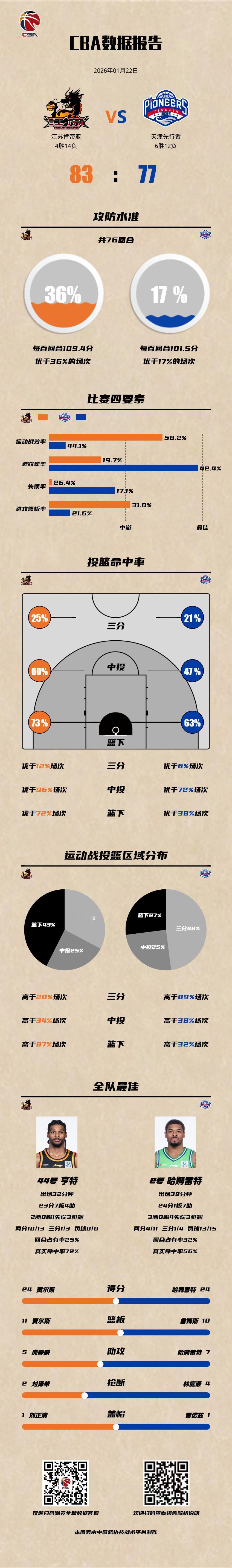 江苏肯帝亚 83-77 天津先行者 江苏男篮vs天津男篮 江苏肯帝亚:贾尔斯24分11篮板,亨特23分7篮板4助攻2抢断,庞峥麟12分3篮板5助攻; 天津先行者:哈姆雷特24分7助攻3抢断,林庭谦18分3助攻4抢断,詹姆斯15分10篮板3抢断。以城之名