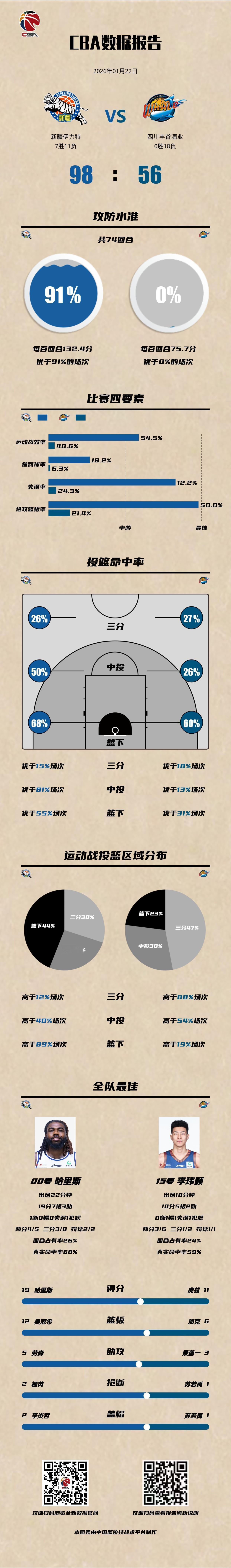 新疆伊力特 98-56 四川丰谷酒业新疆男篮vs四川男篮 新疆伊力特:哈里斯19分7篮板3助攻,纳托尔15分4篮板3助攻,吴冠希13分12篮板; 四川丰谷酒业:庞兹11分3篮板,景菡一10分3助攻,李玮颢10分5篮板。CBA数据库