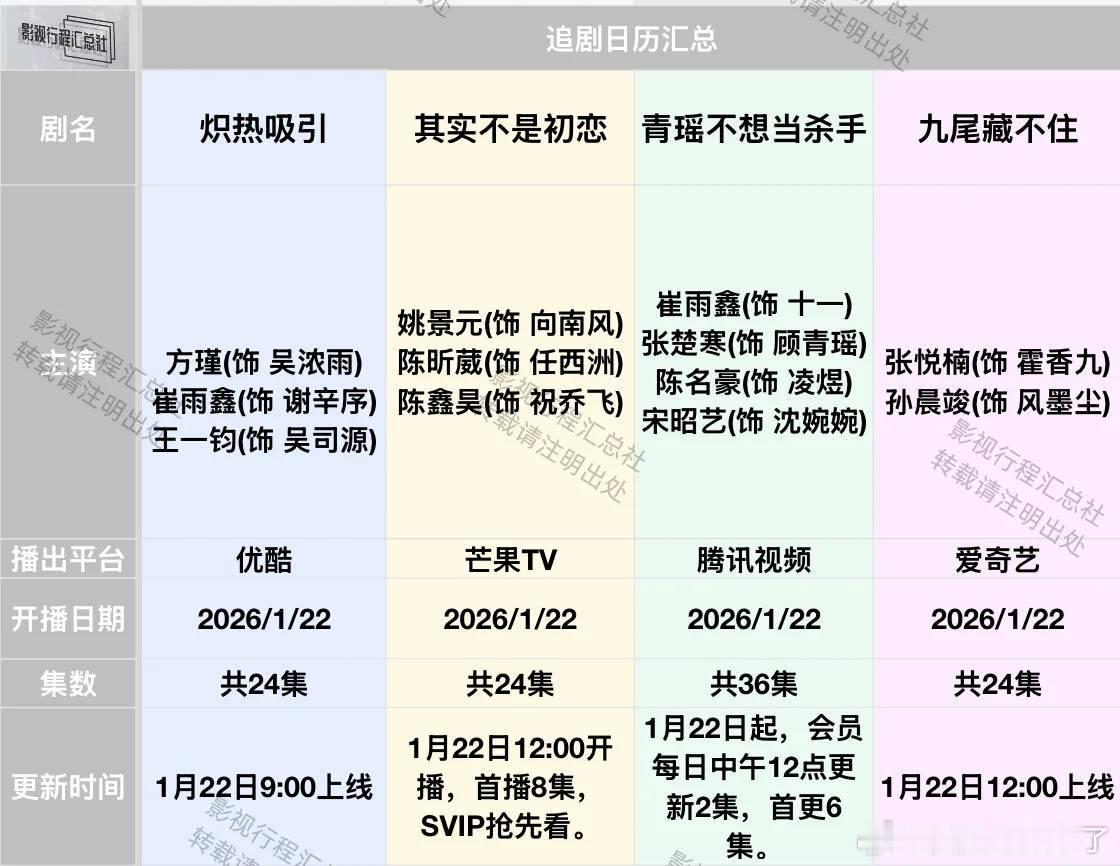 追剧日历更新:1.22-28日开播剧炽热吸引 方瑾 崔雨鑫 王一钧其实不是初恋 姚景元 陈昕葳 陈鑫昊青瑶不想当杀手 崔雨鑫 张楚寒 陈名豪 宋昭艺九尾藏不住 张悦楠 孙晨竣薄情侯爷痴情妾 一航 林秋奈暗处 徐梦洁 王晓赟子 韩浩天伪装家族 杨业明 汤加文 穆乐恩重回87之掌上明珠 姚冠宇 何蕾