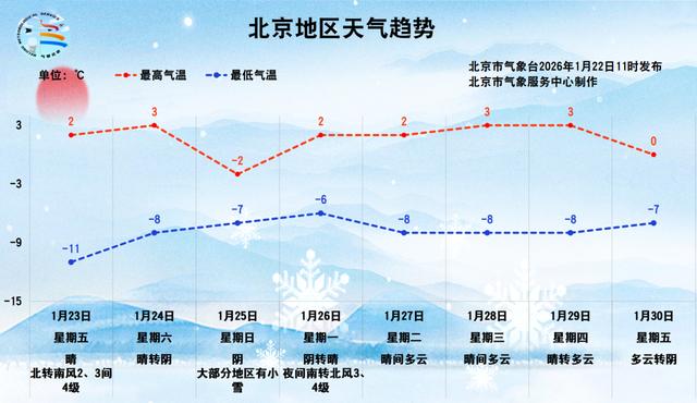 受冷空气影响,预计1月25日,北京大部分地区有降雪天气,白天最高气温随之下滑至冰点以下,阴冷感明显,请大家关注临近预报信息,提前做好防范。