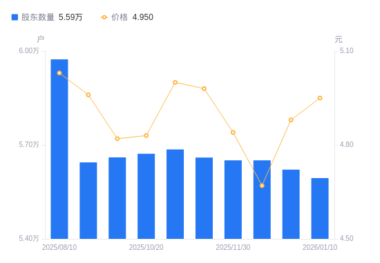 近一年(2024年12月31日至2025年12月31日),齐翔腾达A股股东户数从6.2万户,减低至5.62万户,降幅9.40%,区间股价下跌5.08%。