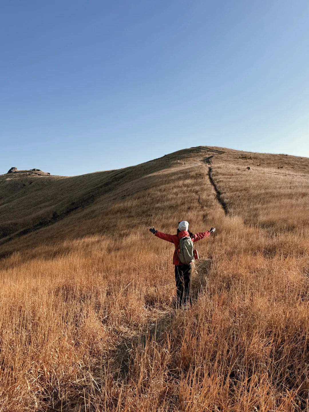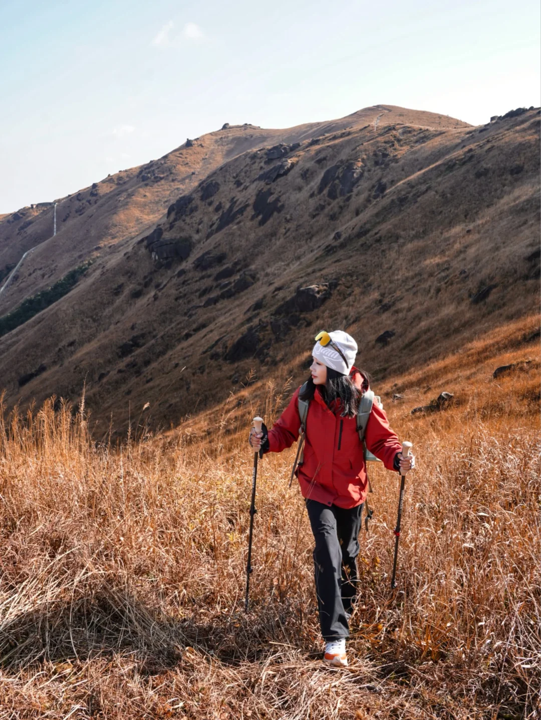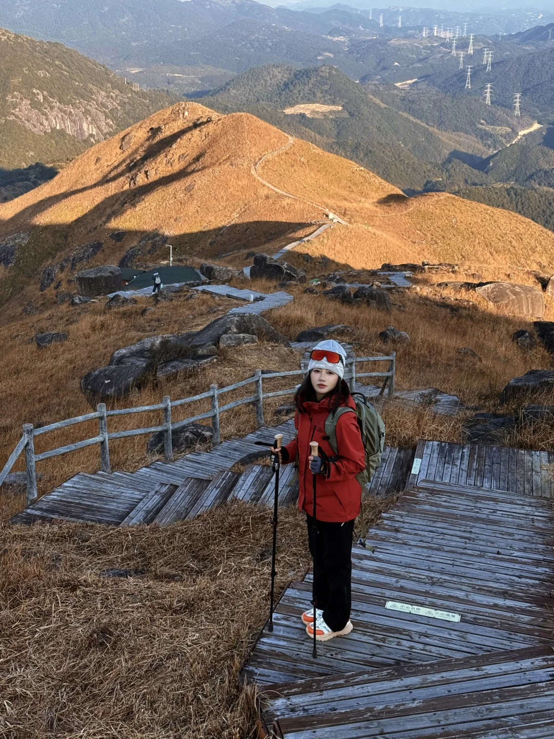 冲锋衣、防风眼镜(能挡风又能防紫外线)、徒步鞋(这次穿了防滑徒步鞋,轻松走完小环线,爬野路也不愁,抓地力还是很稳的)、背包、登山杖、干粮等