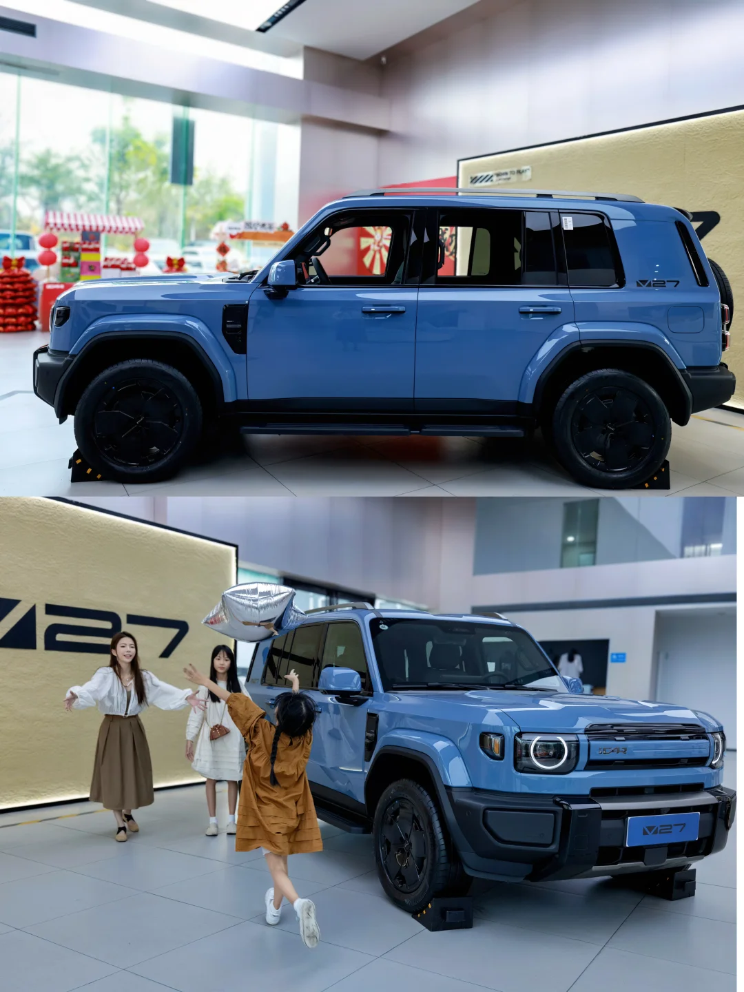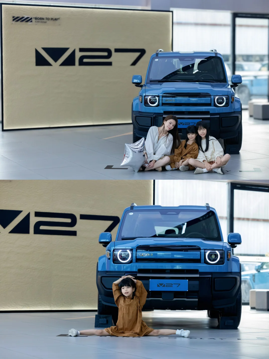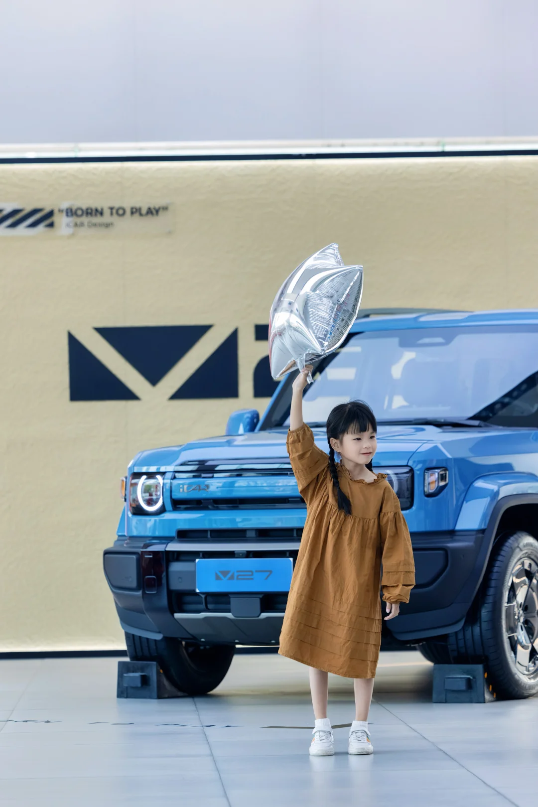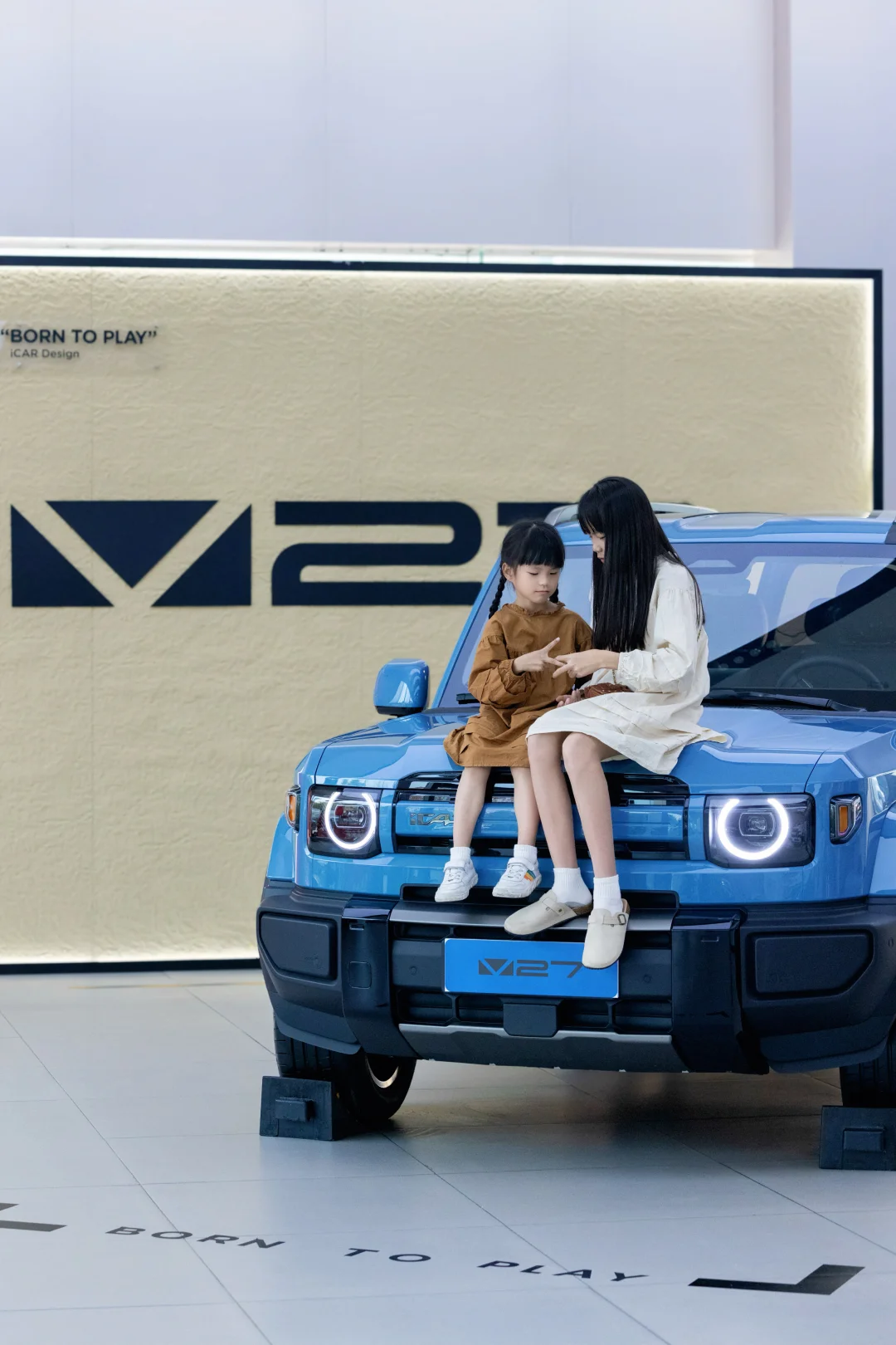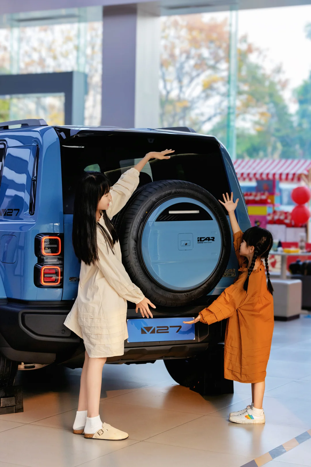 展厅里的iCAR V27,妥妥的C位。方盒子造型配上智能灯组,既有硬派越野的复古力量感,又有电动时代的科技锋芒。小女儿绕着车跑了一圈,对我说:“妈妈,这个大车车好酷!”[哇R]