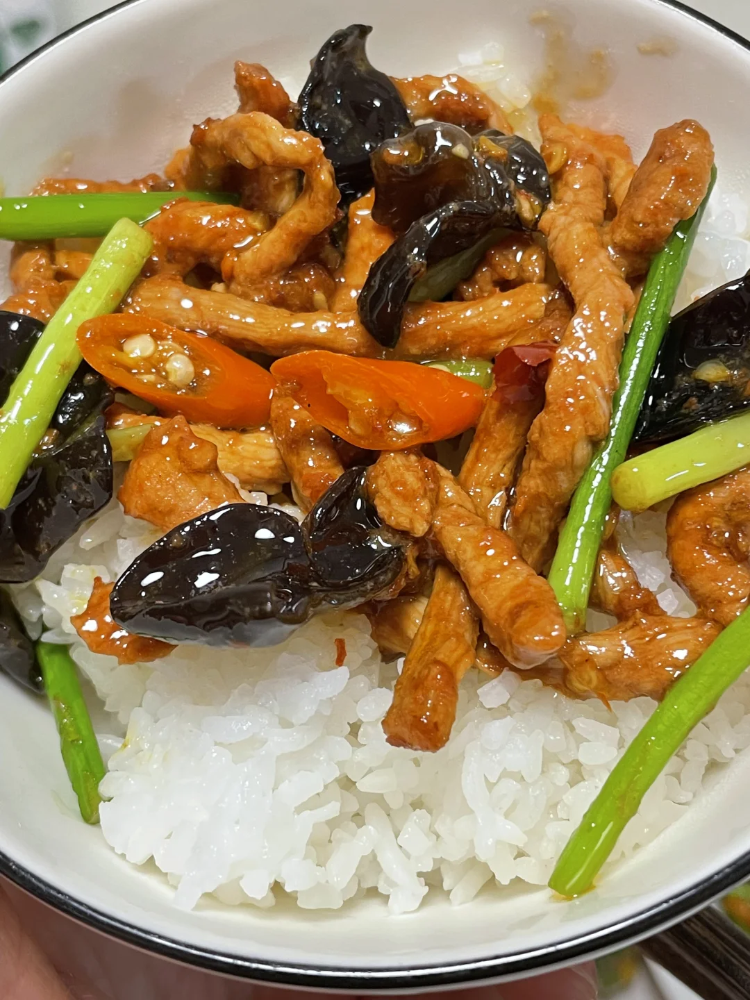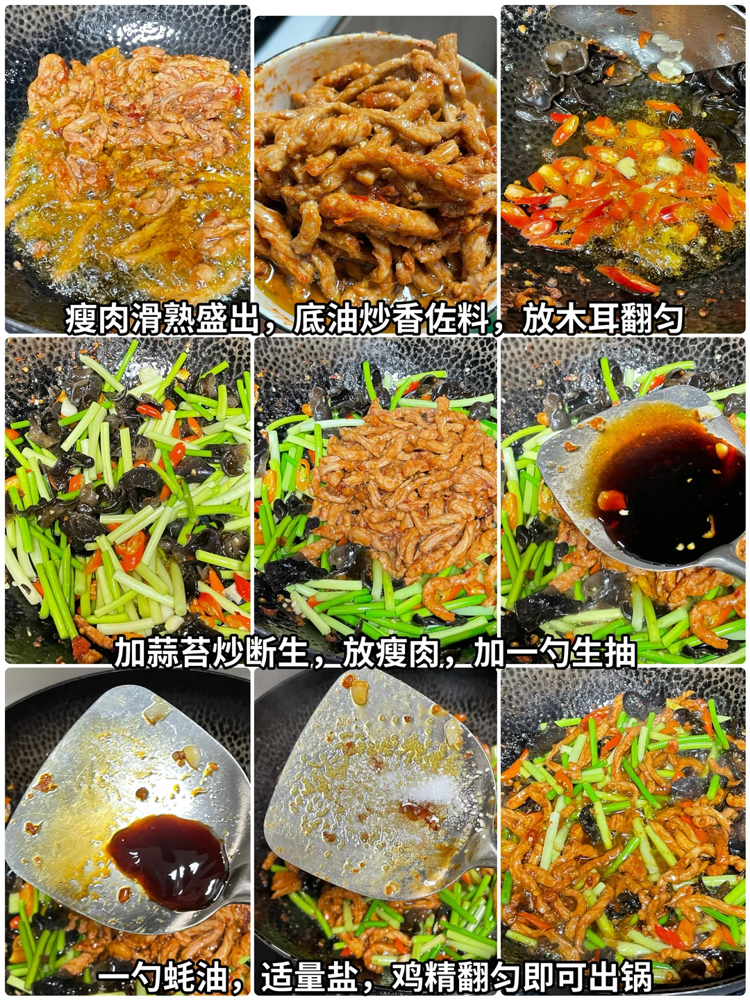 4⃣️油热将瘦肉滑熟盛出。底油放入小米辣和蒜炒香,加入木耳翻炒均匀,放入蒜苔炒至断生,再加入瘦肉调味。来1勺生抽,1勺蚝油,适量的盐和鸡精翻匀即可出锅。喜欢的姐妹可以尝试做一下。