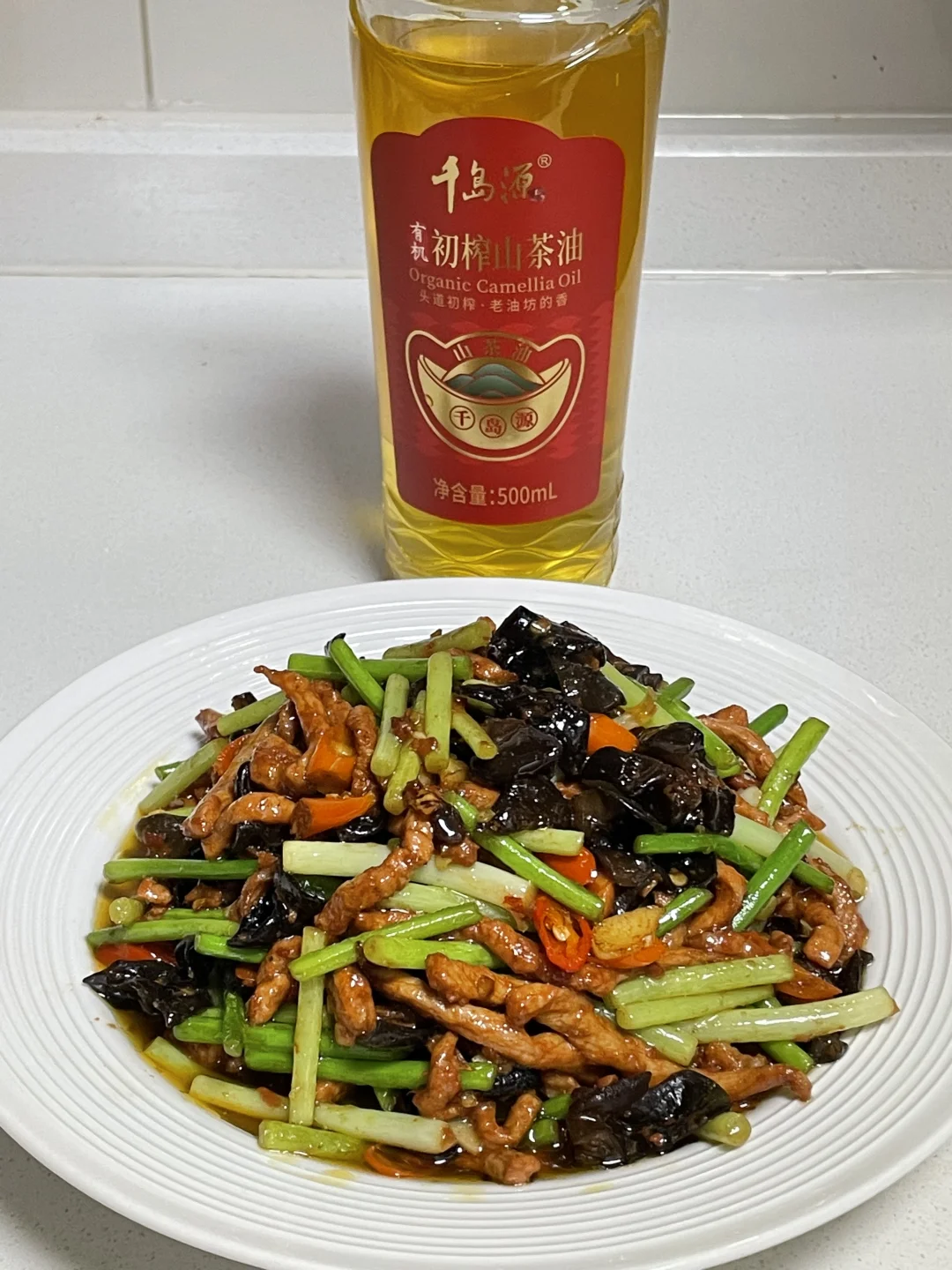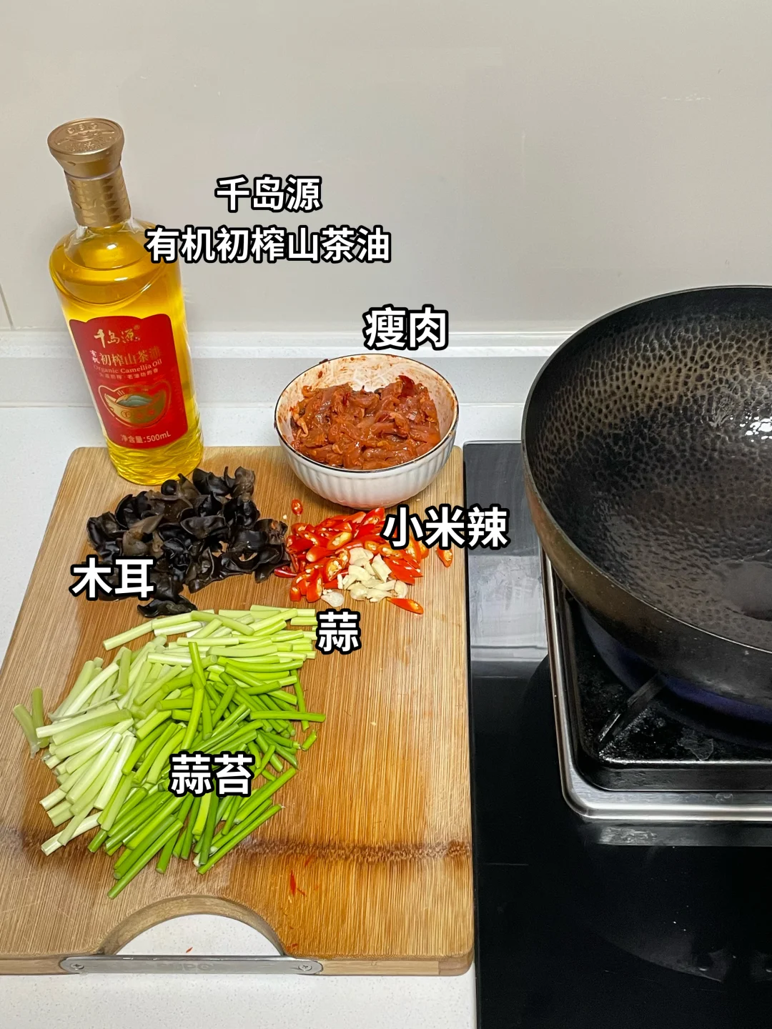 🌶️食材:蒜苔,木耳,瘦肉,千岛源有机初榨山茶油