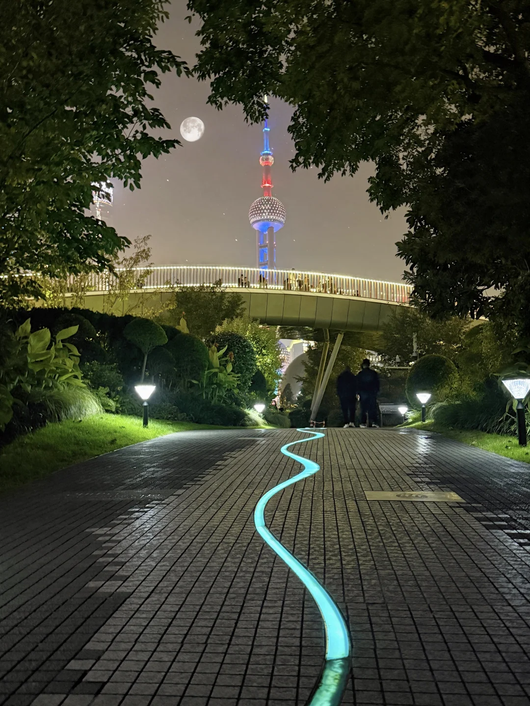 和小巨蛋就在一起,傍晚东方明珠亮起,地面的蓝色荧光路线,真的超美,光影科技感拉满