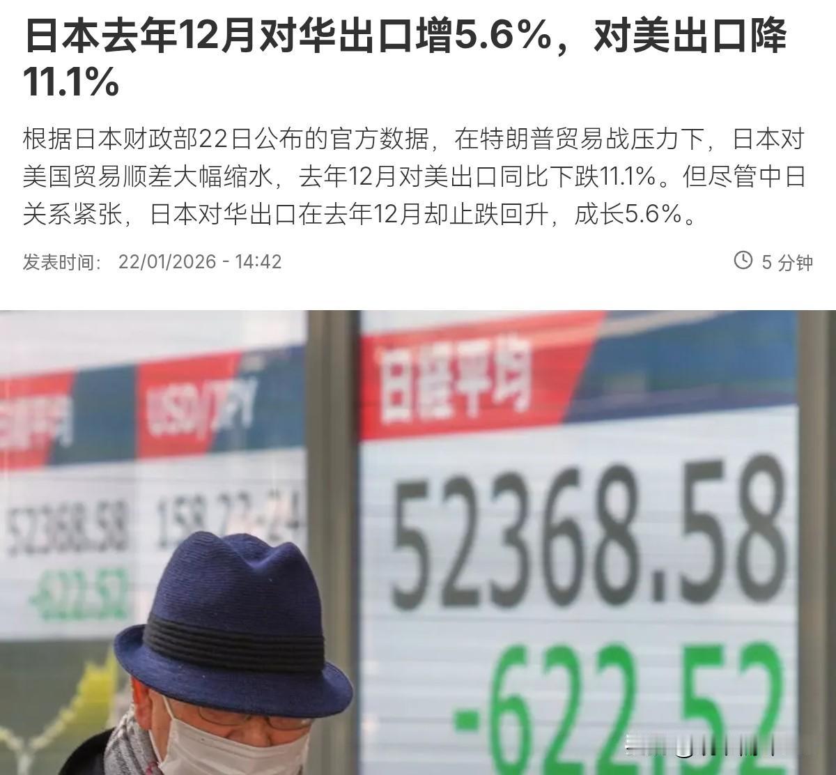高市早苗被狠狠的泼了一盆冷水!没想到日本如此依赖对华出口!1月22日,日本财政部公布的官方数据显示,在特朗普贸易战压力下,日本对美国贸易顺差大幅缩水,去年12月日本对美出口同比下跌11.1%。而尽管中日关系紧张,日本对华出口在去年12月却止跌回升,增长了5.6%。 看见这样一份数据,高市早苗估计倒吸一口凉气。为什么这样说呢?事实上,日本与美国签署的协议在去年9月起就生效了,原本日本以为协议生效可以稳住对美贸易。结果,对美贸易的成绩单却是如此的惨淡。而日本支柱产业——汽车产业的情况就更惨了。数据显示,日本对美出口汽车在12月同比下滑20.4%,零部件出口下跌15.3%。 而汽车产业在日本对美出口贸易中占比相当于三分之一,虽然美日两国在谈判后达成一致,将加征税率降到15%,但这也完全不能阻止日本对美出口的跌势。很显然,高市早苗如果有一点理智,都会意识到一点,别看美日是盟友,但是美国的关税正在极大的创伤日本经济。 而这个时候,中日贸易的重要性就更加凸显出来了。如果没有对华贸易增长5.6%,日本2025年的对外贸易情况恐怕更加惨淡。事实已经很清楚了,现在中日关系完全因为高市早苗本人被卡住,而经贸关系不可能不受影响。如果高市早苗仍旧嘴硬,头铁,中日经贸关系最终必然受到冲击,到时候日本的处境可能将更加艰难。