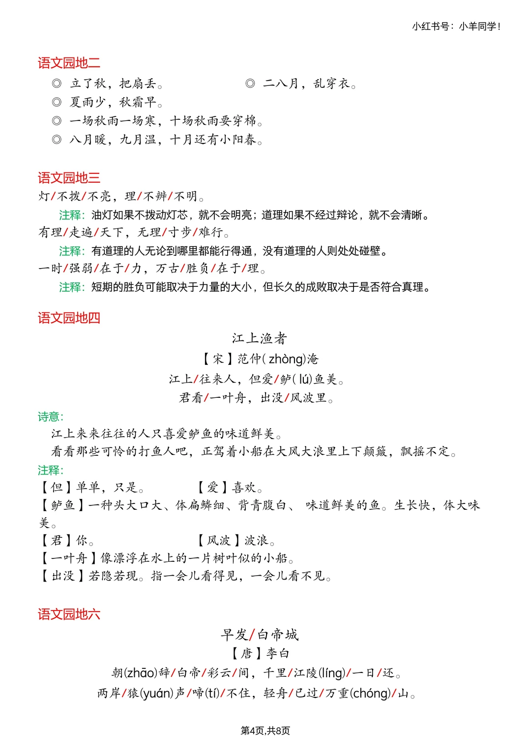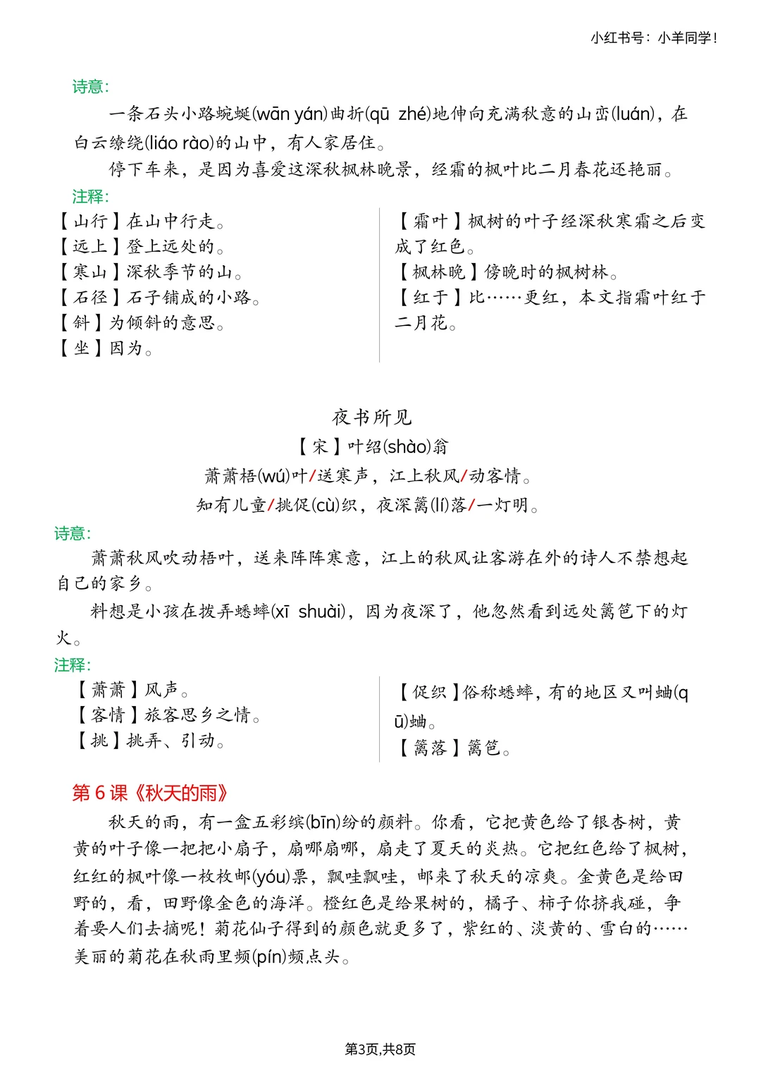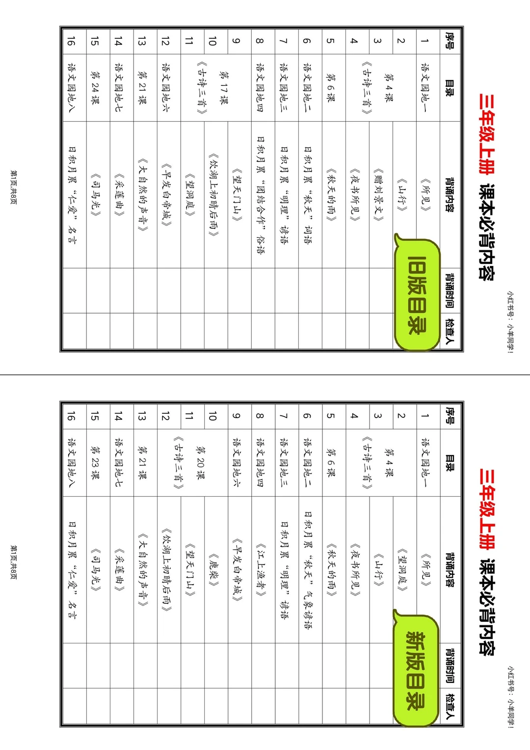 今年三年级上册教材变化超多,让人措手不及!不过别慌~仔细研究后发现,必背内容的变动其实不多!帮大家整理好了关键调整👇 📖 重点改动速览 1⃣ 古诗调整:《望洞庭》从原 17 课移到第 4 课,删掉《赠刘景文》;原 17 课《古诗三首》挪到第 20 课,还新增了王维的《鹿柴》! 2⃣ 语文园地更新: 园地二 “日积月累” 原“秋天词语”换成四上的 “秋天谚语”,氛围感拉满~ 园地四删掉 “团结合作” 俗语,换成范仲淹的《江上渔者》,文学含量 + 1!