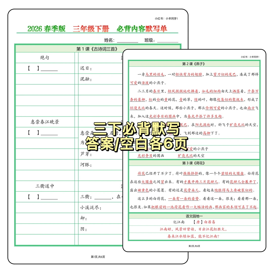 是2026春季版啦~改版后新课标的! 划重点!所有必背内容都包含在内~ 虽然三下必背的不算多,但确实有点琐碎😅 贴心准备了两份: ✅空白版(6页):用来默写超方便 ✅答案版(6页):对照检查更省心 有了这两份,娃的必背内容掌握起来事半功倍~ 需要的宝子左下角店铺获取~ ⚠️原创整理,禁止转载发布网络平台。