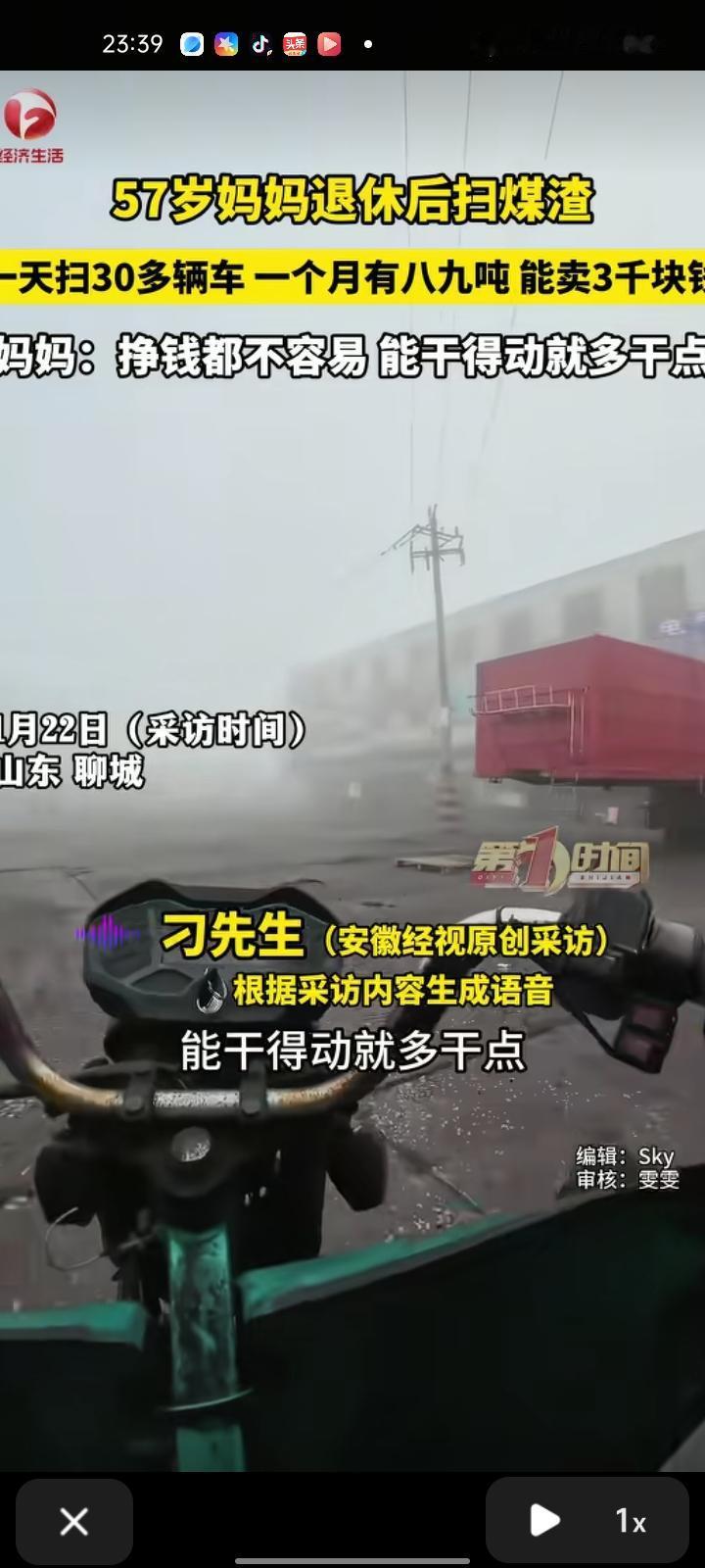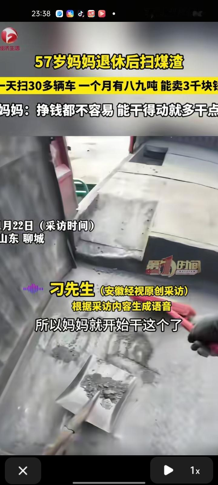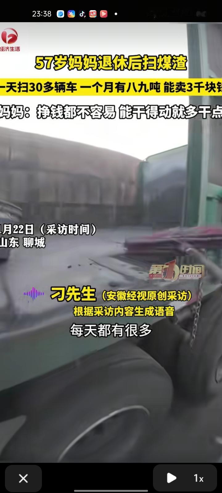 1月22日,山东聊城。57岁妈妈退休后扫煤渣,一天扫30辆车,一个月有八九吨,能卖3000元。 儿子刁先生表示,自家住在国道旁的村子里,每天有很多拉煤的大货车,有很多散落的煤炭,所以妈妈就开始干这个了。妈妈是位特别勤劳,能吃苦耐劳的人,想挣点钱养老,不想给孩子添负担。妈妈说,挣钱都不容易,能干的动就多干点。