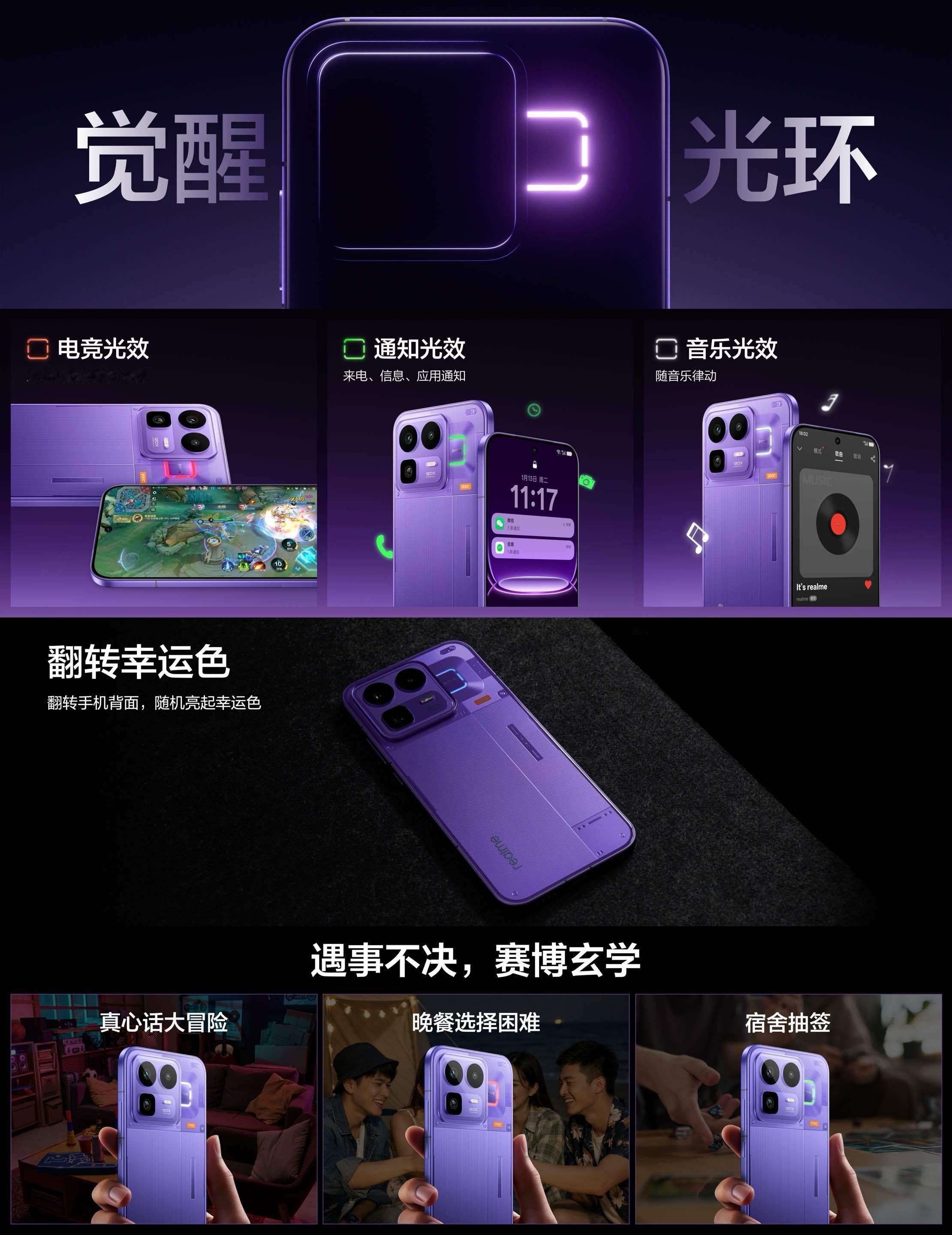 真我Neo外观真我Neo8全新透明RGB设计首创单层透明立体分区工艺,配合机械浮雕设计11 种深浅纹理,Make it real铭牌。【灯带回归】支持电竞、通知、音乐等专属光效,游戏联动、音乐律动、拍照倒计时、智慧弹码等功能之外,更有独创翻转幸运色,翻转手机背面,随机点亮每日幸运色。【质感升级】磨砂金属中框+透明玻璃后盖,优雅大R角,正面超窄视觉四等边。【多元潮玩电竞配色】「赛博紫」「起源白」「机甲灰」大家觉得怎么样?
