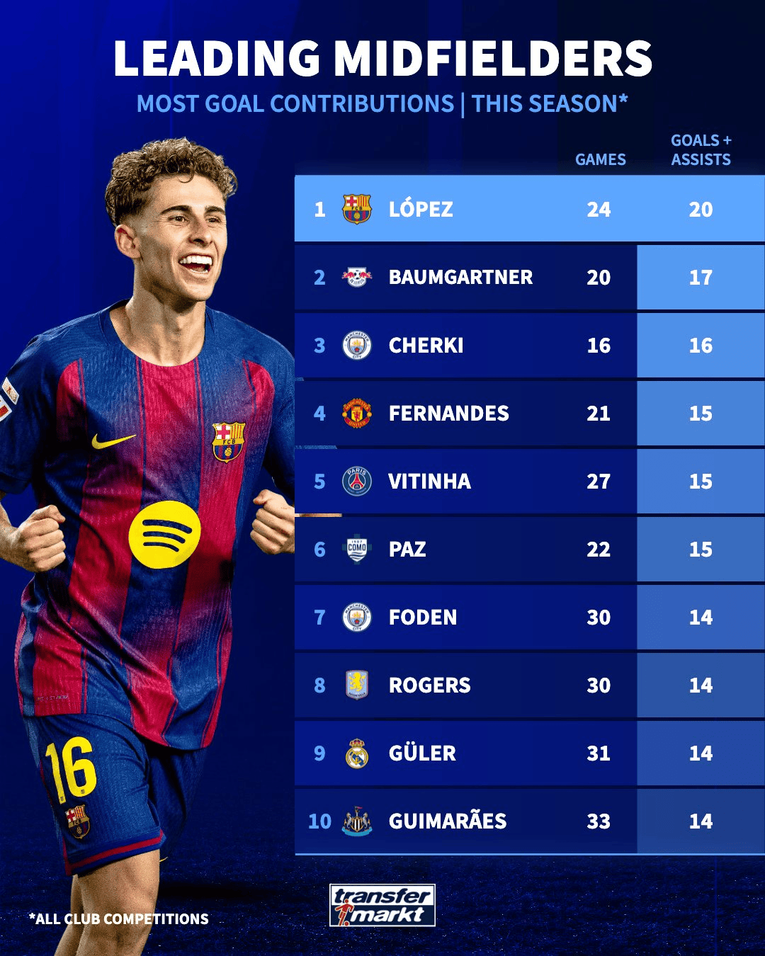 数据显示,费尔明本季已出战24场,交出20次进球贡献(进球+助攻),成为榜单唯一“20+”的中场球员。紧随其后的是莱比锡的鲍姆加特纳(20场17次)与曼城的谢尔基(16场16次);曼联的B费、巴黎的维蒂尼亚、科莫的帕斯则以15次并列其后。