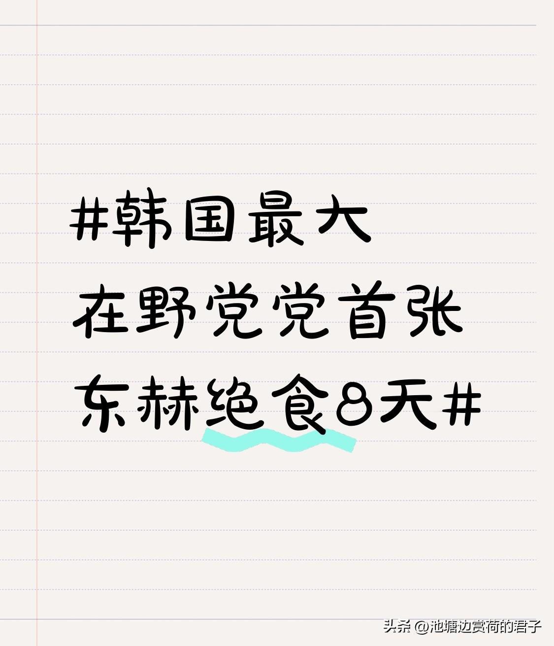 韩国最大在野党党首张东赫绝食8天 韩国政治圈又整出大动静,最大在野党国民力量党党首张东赫绝食8天。他从1月15日开始在国会大厅静坐示威,诉求是让执政党接受“双重特别检察”法案。 1月22日,前总统朴槿惠罕见现身国会探望,自2016年底被弹劾后她可是头回访问国会主楼。朴槿惠劝张东赫别再绝食,说继续下去身体吃不消,即便法案没通过,人民也认可他的诚意。张东赫听劝结束了绝食。有人说这是在学李在明,看来绝食在韩国政治里成了解决问题的“法宝”,真是让人感叹韩国政坛这独特的操作。