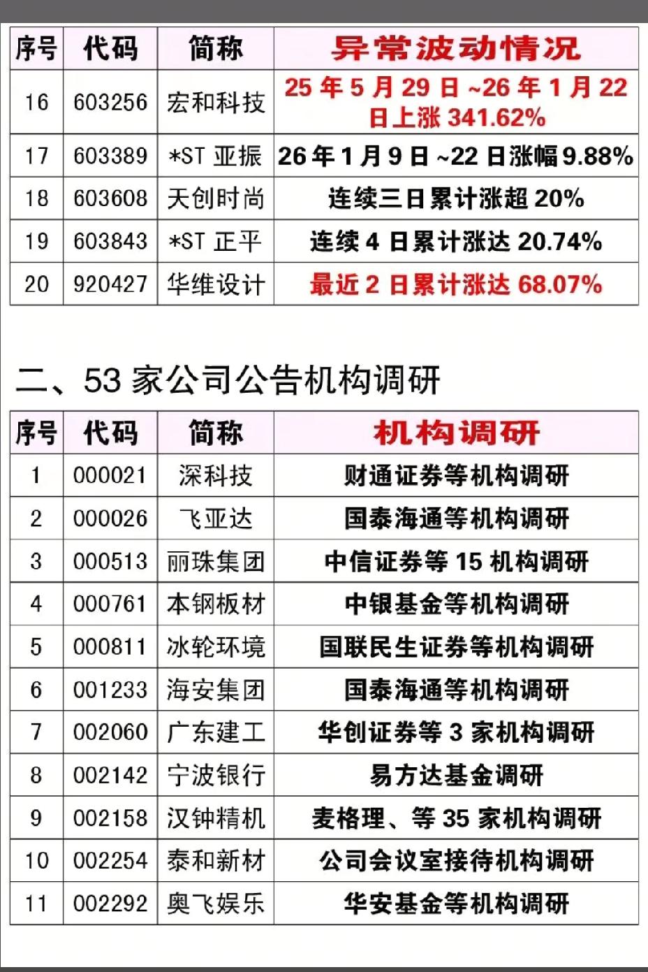 1月23日周五,A股异常波动、机构调研公告一览表!!! 白银有色连续3日累计涨幅达33.19%;明阳智能重组前20天涨44.6%;浙文互联连续三日涨幅超20%;洲际油气连续三日涨幅超20%;华维设计最近2日涨幅达68.07%;53家公司公告机构调研!!!