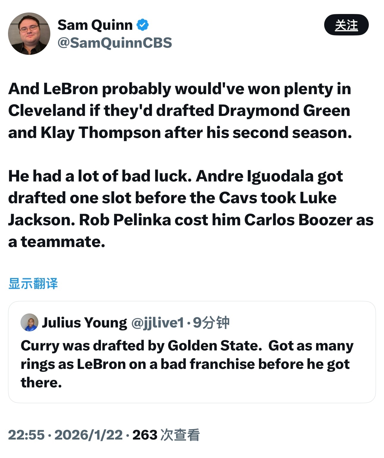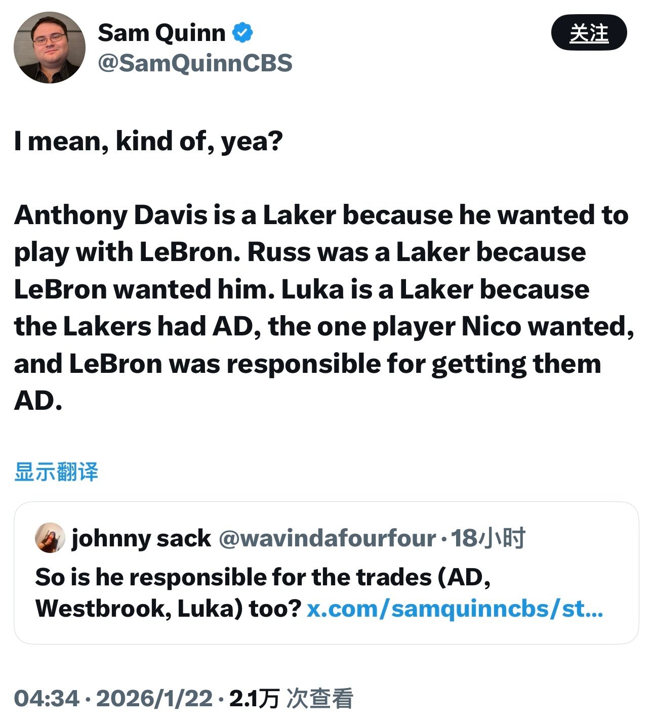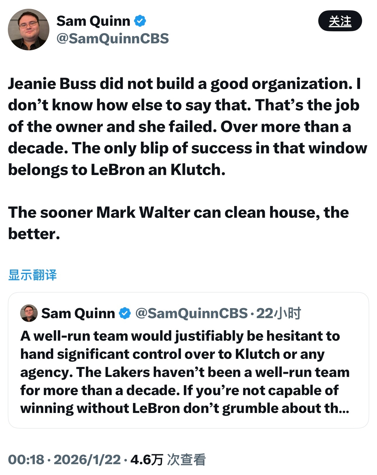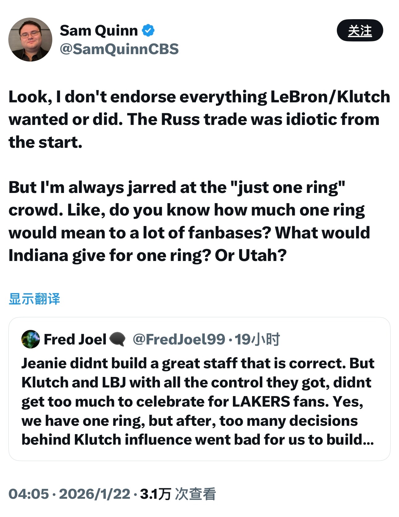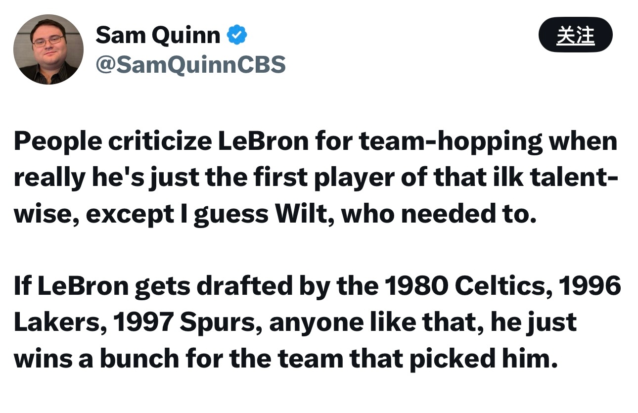 CBS记者Sam Quinn今天回复了一些网友的提问,理性且客观。图1—我不是说勒布朗和Klutch做的所有事都是对的,比如威少的交易,从一开始就是个昏招。但我真的烦透了那些说“就拿过一个冠军”的人。你知道一个冠军对多少球队的球迷来说意味着什么吗?步行者愿意付出什么代价换一个冠军?爵士呢?图2—珍妮·巴斯没建立起一个良好的球队运营体系,这本来就是老板的职责,而她十多年来都没做到。这十多年里,唯一的成功就是勒布朗和Klutch带来的。马克·沃尔特越早彻底整顿管理层越好。图3—如果骑士在勒布朗第二个赛季后选到追梦格林和克莱汤普森,他在克利夫兰说不定已经拿了好几个冠军了。他的运气真的太差了,伊戈达拉在卢克杰克逊之前被选走,罗伯·佩林卡(时任布泽尔经纪人)还搞砸了让他继续在骑士与年轻詹姆斯一起拼搏的机会。图4—安东尼·戴维斯来湖人,是因为他想和勒布朗一起打球。威少来湖人,或许是因为勒布朗想要他。东契奇来湖人,是因为湖人有戴维斯。尼科想要的就是戴维斯,而湖人正是因为有了勒布朗才能得到戴维斯。图5—NBA历史级别的巨星往往都很幸运。魔术师被选到了有贾巴尔的球队,科比去了有奥尼尔的球队,邓肯被选到了有罗宾逊和波波维奇的马刺,伯德的经理很快就给他找来了帕里什和麦克海尔,乔丹身边有皮蓬和菲尔·杰克逊。勒布朗的生涯,就是当这种级别的球员不得不自己创造运气时的样子。图6—人们骂勒布朗“抱团”,但实际上他只是第一个这种级别的天才球员(除了张伯伦)不得不这么做而已。如果勒布朗被1980年的凯尔特人、1996年的湖人、1997年的马刺选中,他只会为选中他的球队赢下一堆冠军。