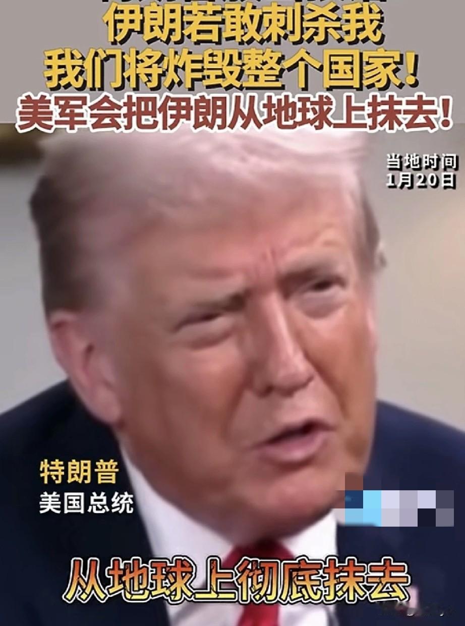 1月20日,特朗普放出狠话:伊朗若敢刺杀我,我们将炸毁整个国家!把伊朗从地球上彻底抹去! 主持人:“他们(伊朗)在周末对您发出了暗杀威胁,我知道您不能谈论具体细节,但鉴于伊朗政权领导层持续挑衅和威胁您,尤其是在周末期间,您对此有何回应,您曾说过伊朗需要新的领导层。” 特朗普:“嗯,他们不应该这么做,但我已经发出通知,一旦发生任何事,我们将炸毁整个国家,它会被炸掉的。所以你知道,拜登原本应该在他们发表声明时就说些什么,我们总是说拜登什么都不说,因为他什么都没说,但总统必须捍卫自己的总统。比如,如果我在这里,他们也是这样对待别人,哪怕不是总统,就像对待我一样,我一定狠狠地打击他们。我有非常明确的指示,无论发生什么,他们(美军)都会把这些人从地球上彻底抹去。”