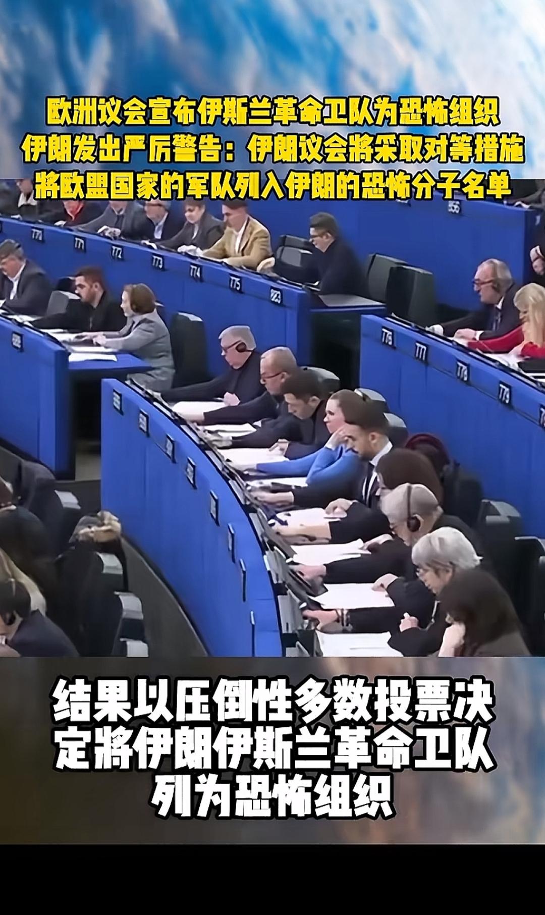 被列为恐怖组织,就会失去法律保护,如过街老鼠,人人可得而诛之。伊斯兰革命卫队在欧洲现在就是这待遇。 1月22日,欧洲议会以压倒性多数投票通过将伊斯兰革命卫队及其附属组织圣城旅、加巴斯基民兵列为恐怖组织的决议,这一决议对伊朗政权柱石——伊斯兰革命卫队及其附属组织,具有毁灭性的意义,这个集团在欧洲庞大的商业网络及秘密银行账户都会被冻结,任何与之有业务往来的个人或企业都将面临刑事指控,其结果就是,伊斯兰革命卫队在欧洲的经济获取被掐断掐灭,而欧洲国家若参与美国对伊朗接下来的军事打击,则获得了法律绿灯。 伊朗所处的国际环境已是历史最差。
