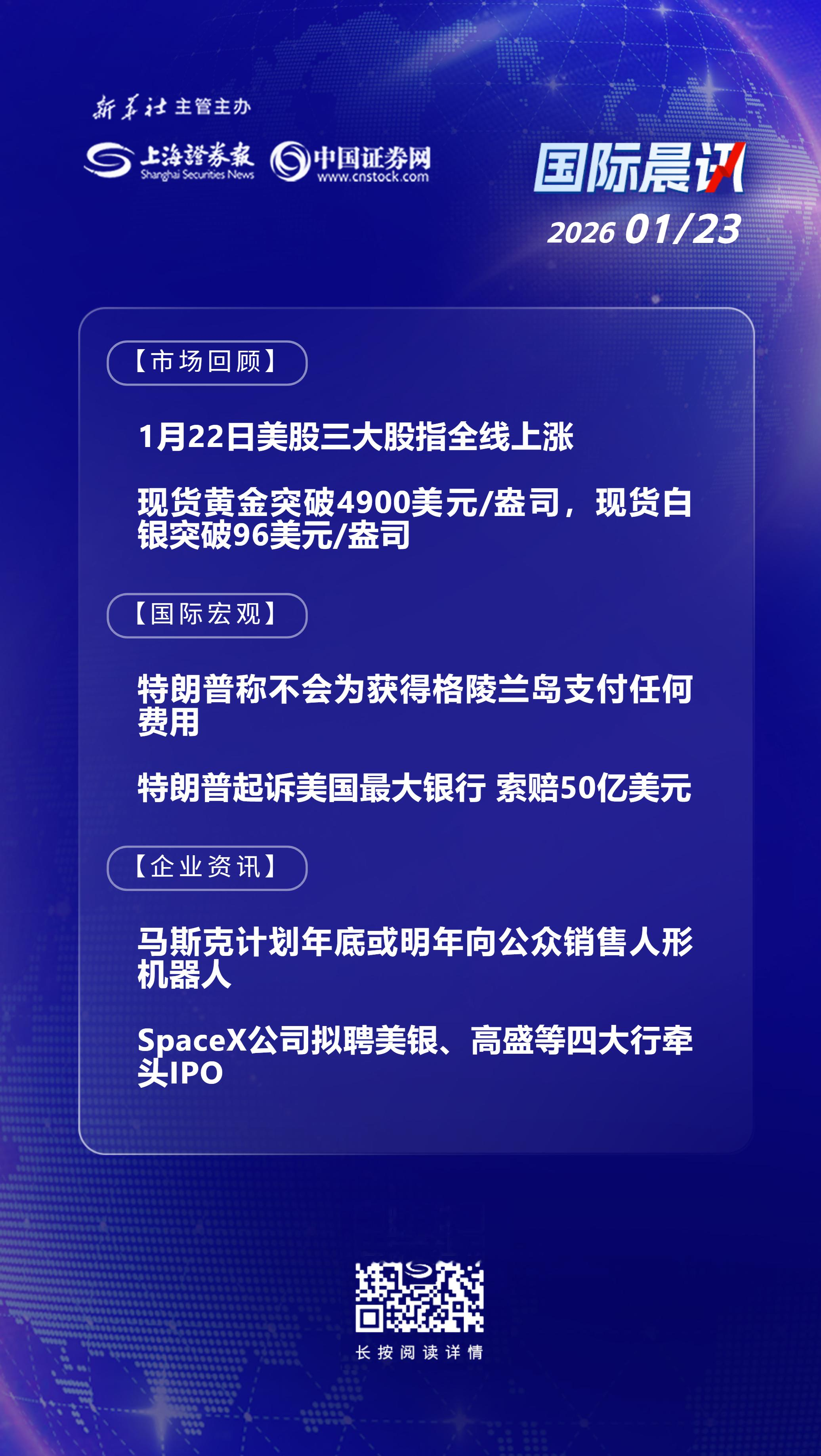 当地时间1月22日,美股三大股指全线上涨:道指涨0.63%报49384.01点,标普500指数涨0.55%报6913.35点,纳指涨0.91%报23436.02点。科技股普涨,Meta收涨5.7%,特斯拉涨超4%,甲骨文涨超2%。