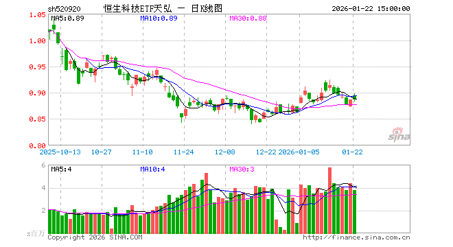 1月22日,恒生科技ETF天弘(520920)涨0.00%,成交额3.36亿元。当日份额增加2.00亿份,最新份额为152.09亿份,近20个交易日份额增加31.90亿份。最新资产净值计算值为134.96亿元。