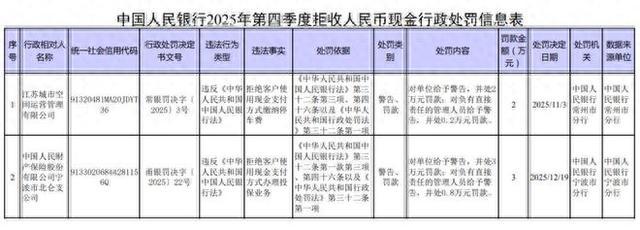 1月22日,中国人民银行发布2025年第四季度拒收人民币现金行政处罚情况。江苏城市空间运营管理有限公司因拒绝客户使用现金支付方式缴纳停车费,中国人民财产保险股份有限公司宁波市北仑支公司因拒绝客户使用现金支付方式办理投保业务,分别被警告并罚款2万元、3万元,对负有直接责任的管理人员给予警告并罚款。