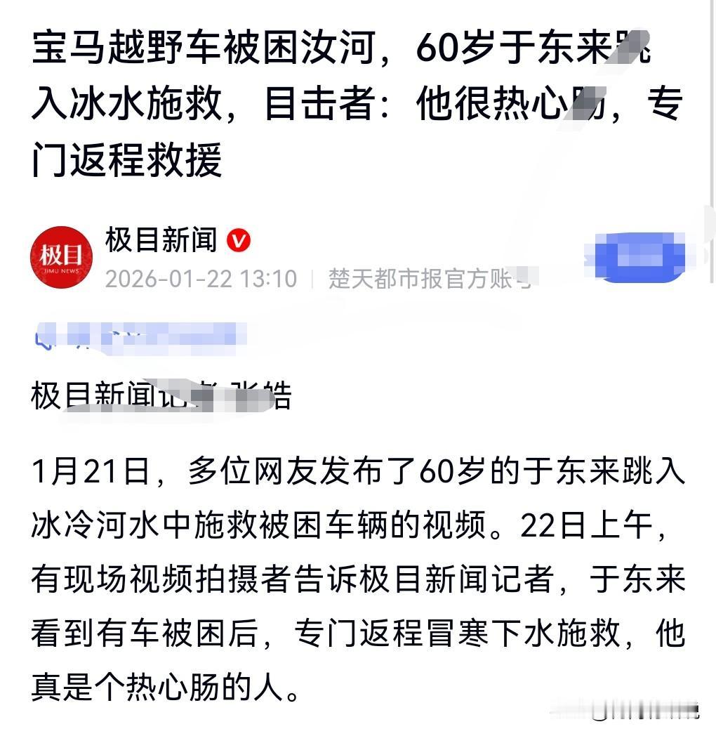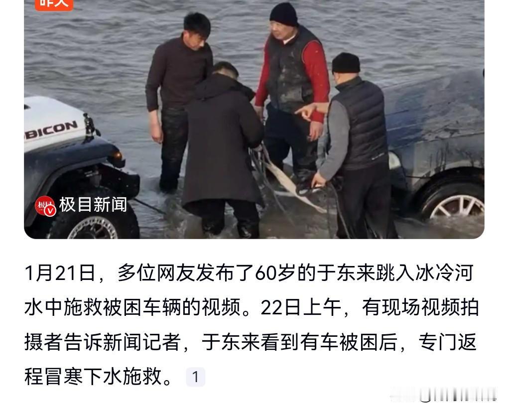 这确实让人难以想象啊。一个这么有钱的大老板,竟然跳到冰水中施救被困车辆。 为什么这个事情值得肯定?因为像这么有钱的上亿身家的人,很少跳入冰水中干这种事。 但是于东来能够接地气做出这种事,确实值得肯定。 不过这也说明了一个问题,那就是玩越野车的时候一定要注意安全。 不要什么地方都开过去,很容易引发危险的。